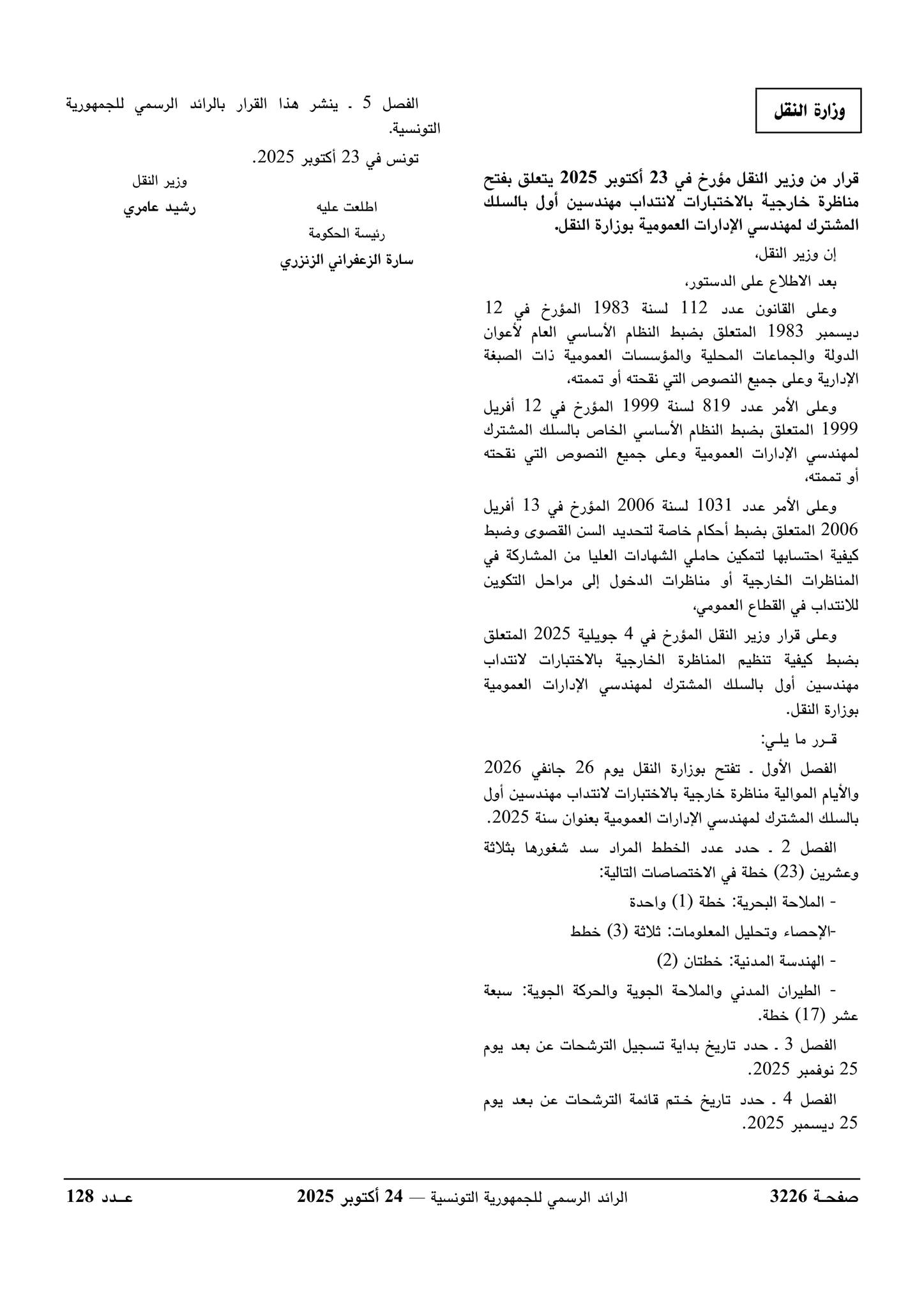 تعتزم وزارة النقل فتح مناظرة خارجية بالاختبارات لانتداب (23 خطة) مهندسين أول بالإدارات العمومية، وذلك حسب ماورد بقرار وزير النقل المؤرخ في 23 أكتوبر 2025.