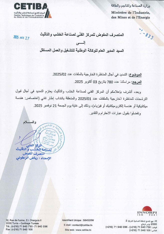 أعن المركز الفني لصناعة الخشب والتأثيث عن تمديد آجال الترشح للمناظرة الخارجية المشفوعة بالإختبارات الكتابية والشفاهية لانتداب (1 خطة) إطار تقني.