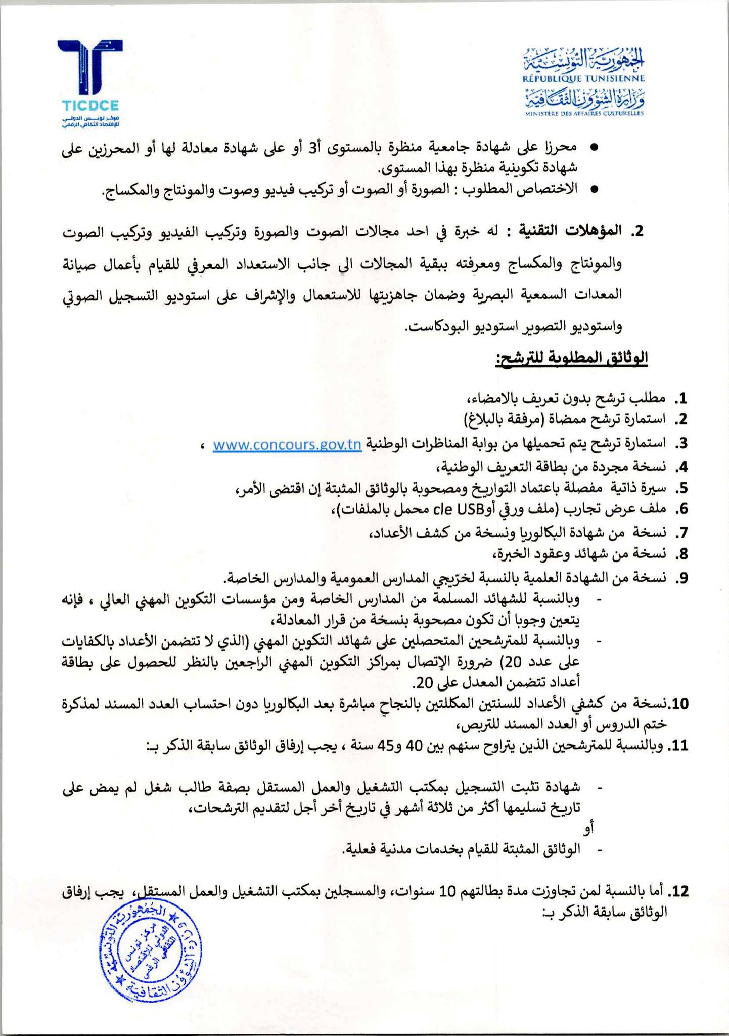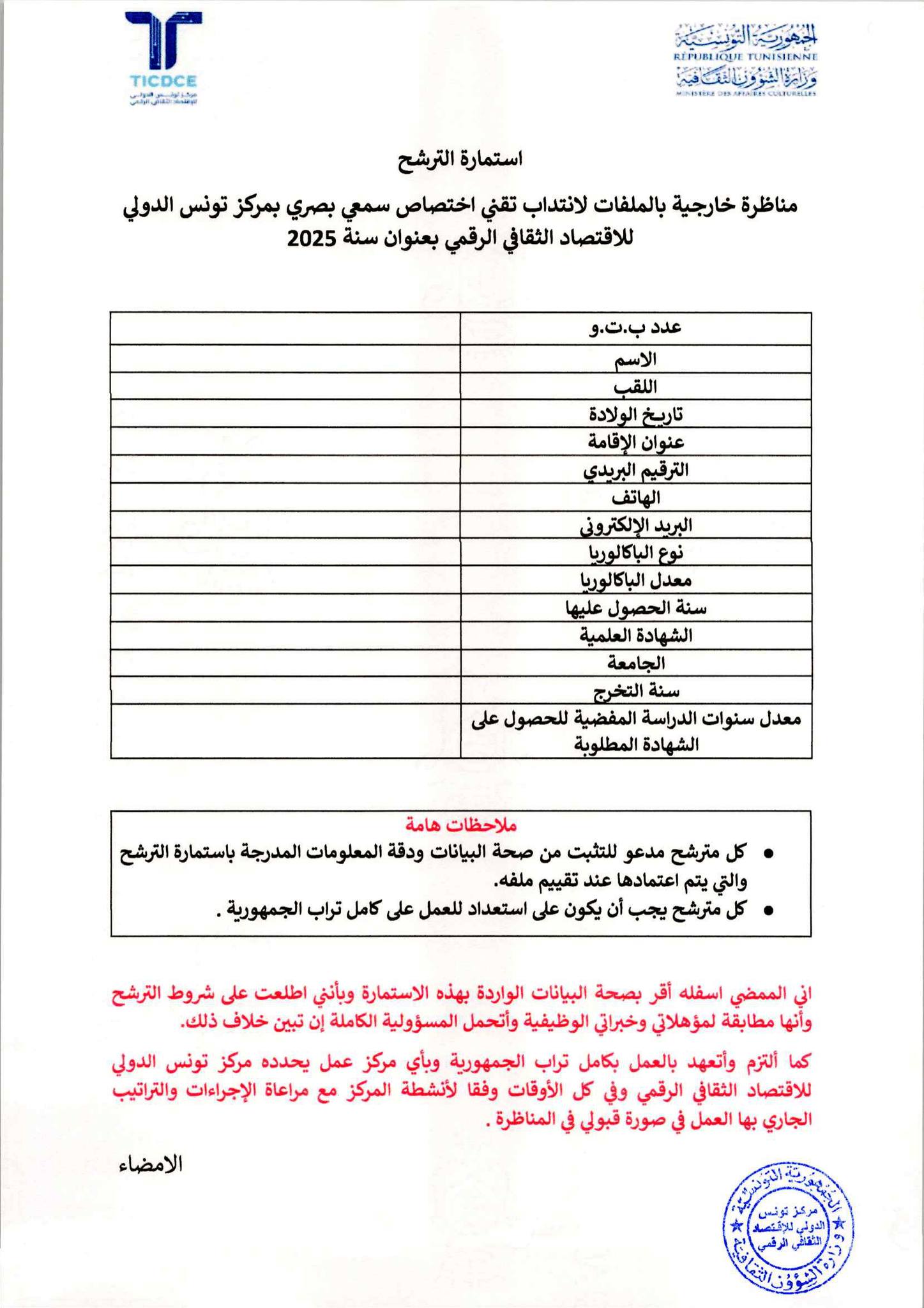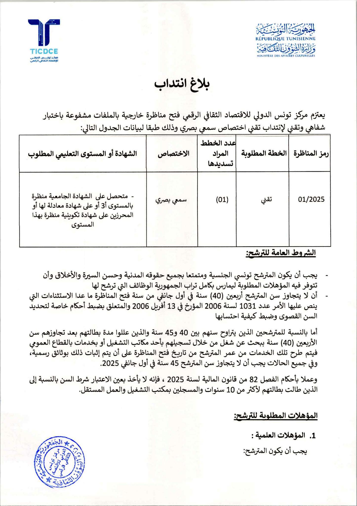 أعلن مركز تونس الدولي للإقتصاد الثقافي الرقمي عن فتح مناظرة خارجية بالملفات مشفوعة باختبار شفاهي وتقني لإنتداب تقني اختصاص سمعي بصري.