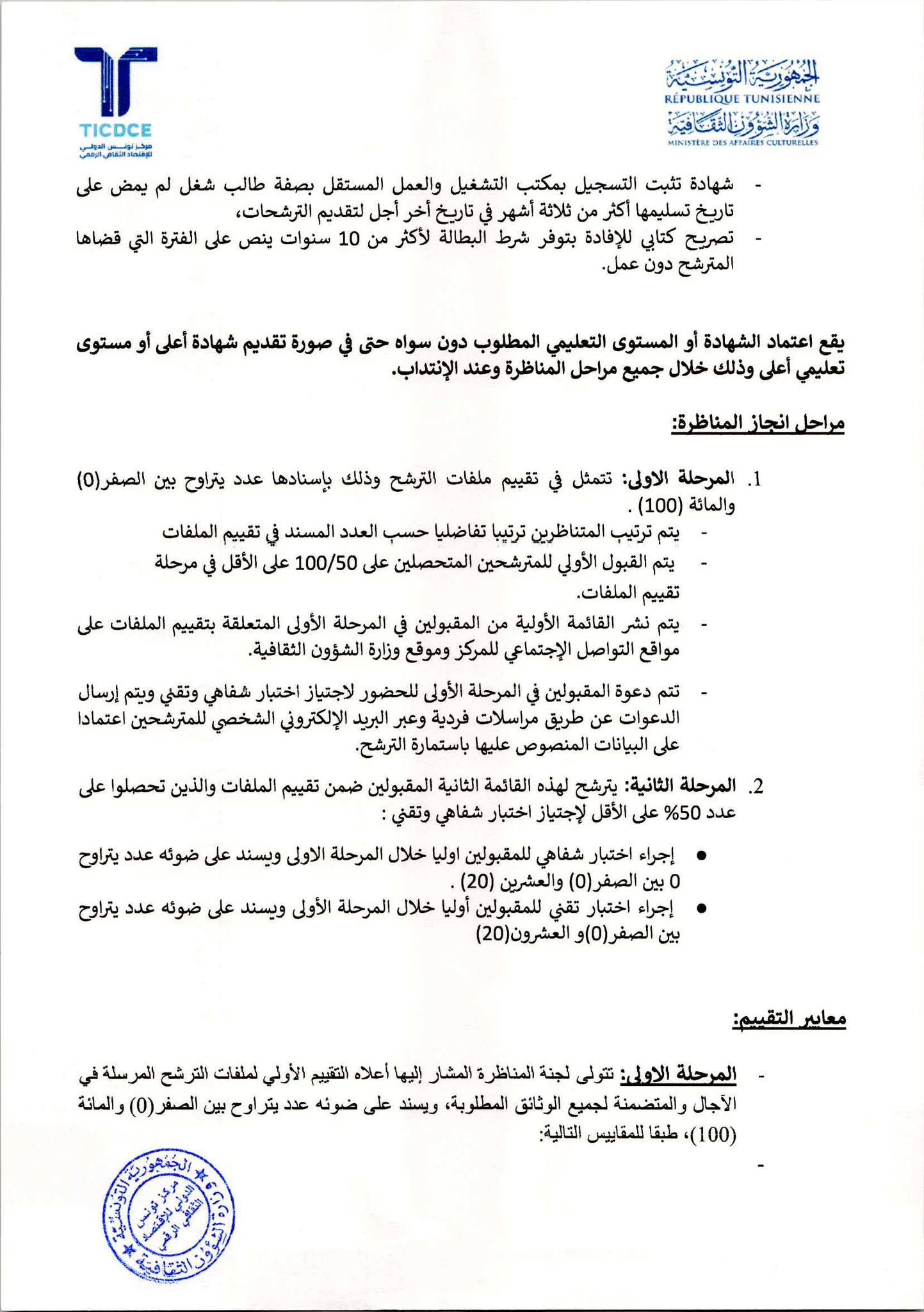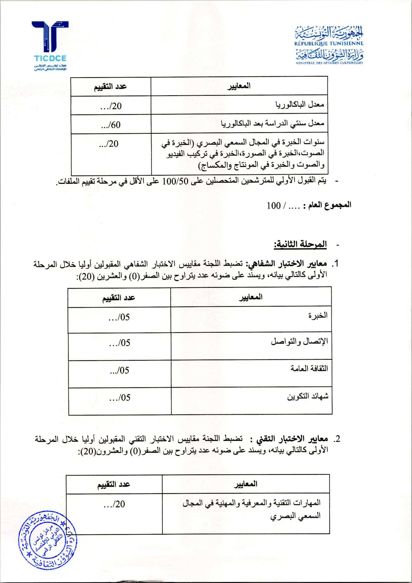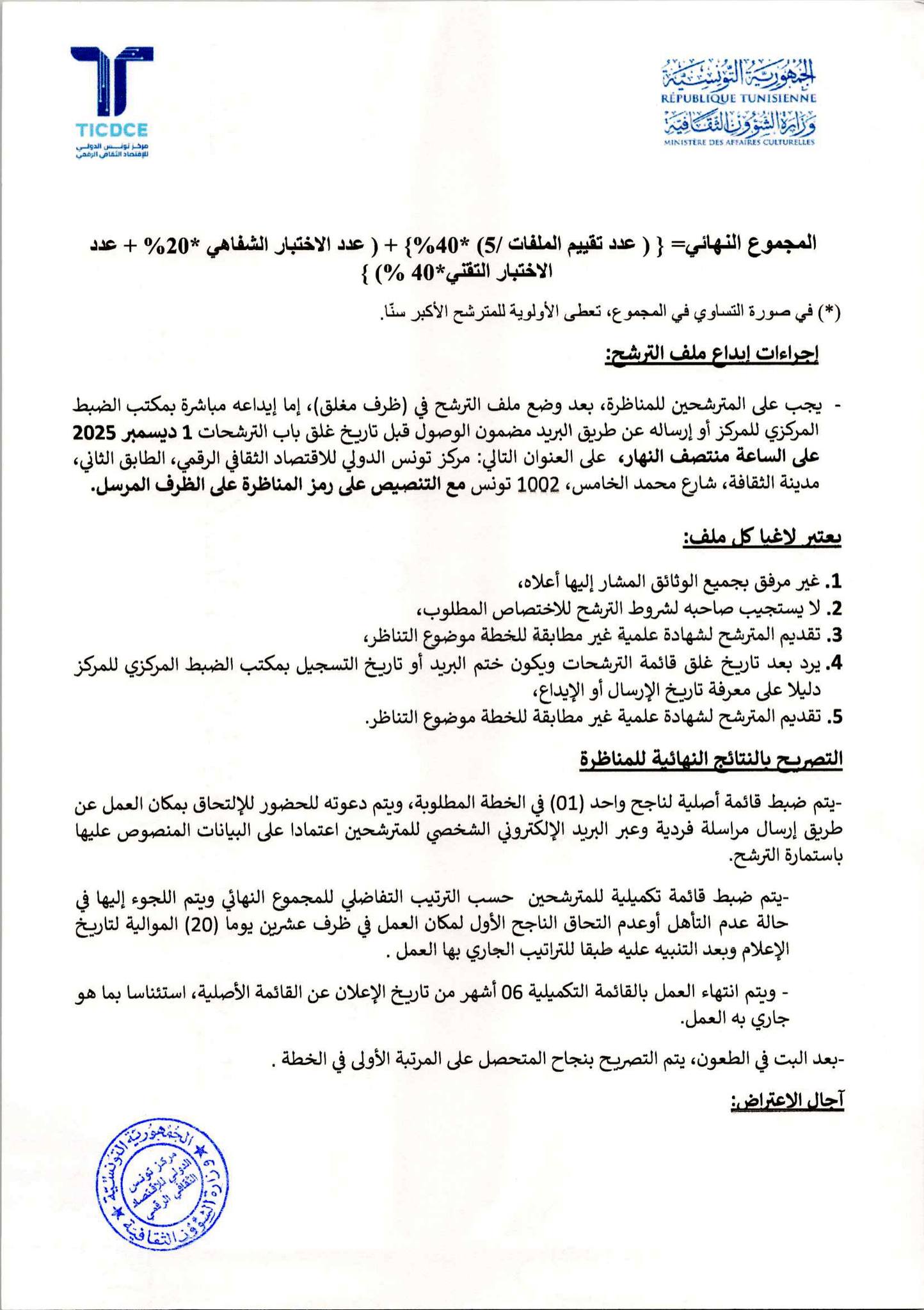 أعلن مركز تونس الدولي للإقتصاد الثقافي الرقمي عن فتح مناظرة خارجية بالملفات مشفوعة باختبار شفاهي وتقني لإنتداب تقني اختصاص سمعي بصري.