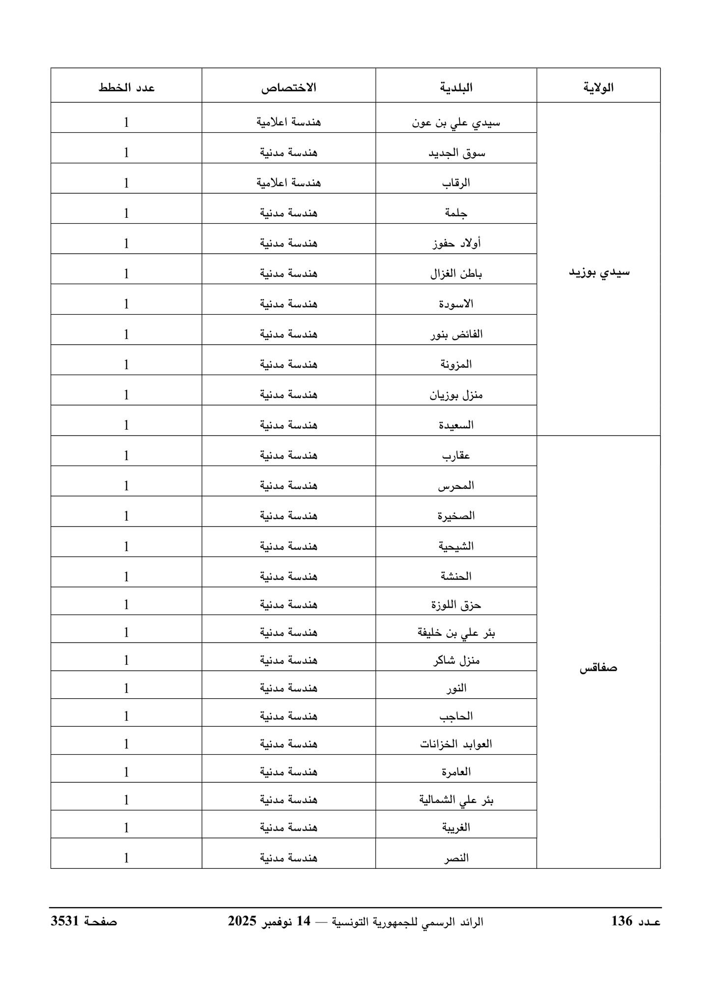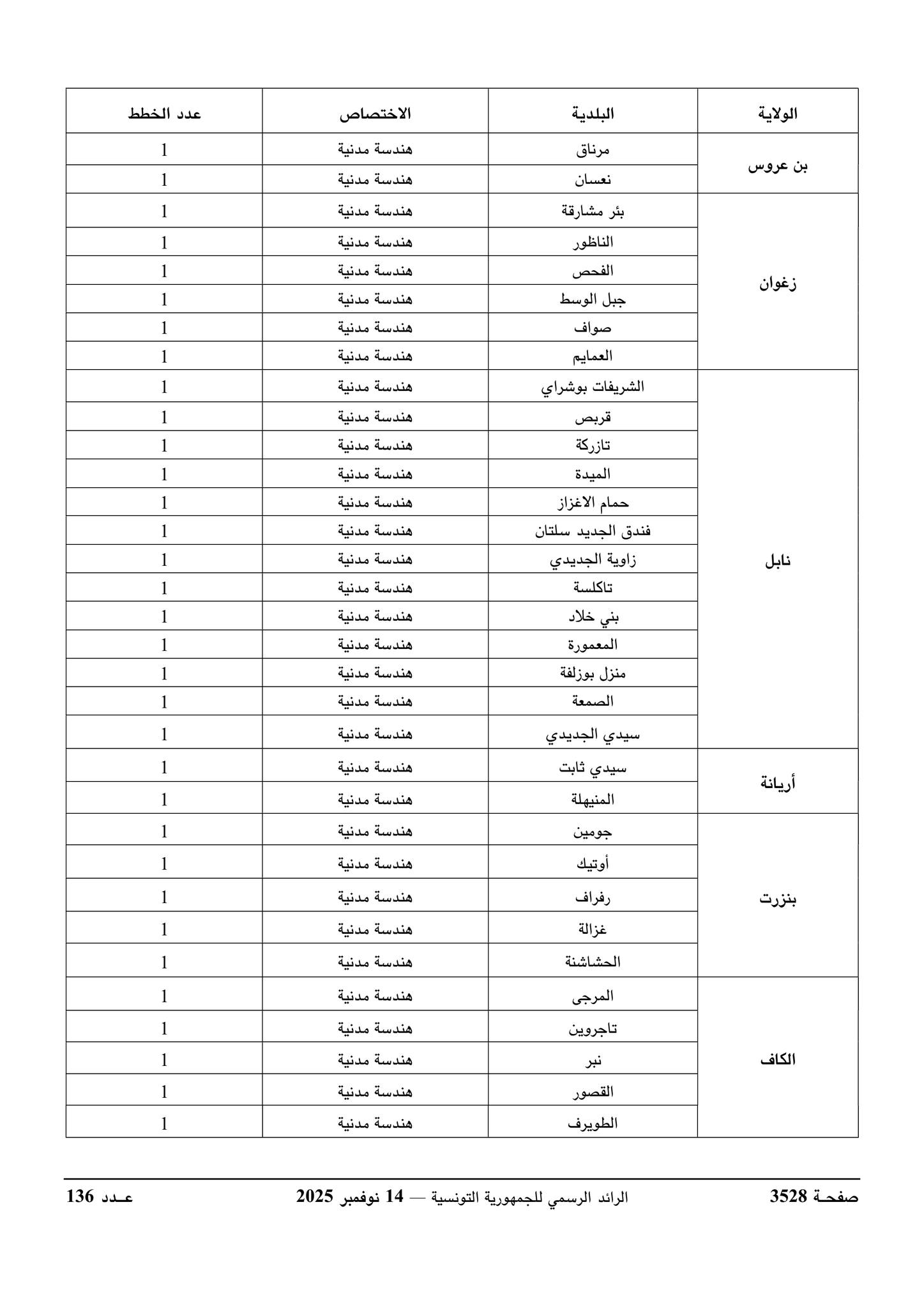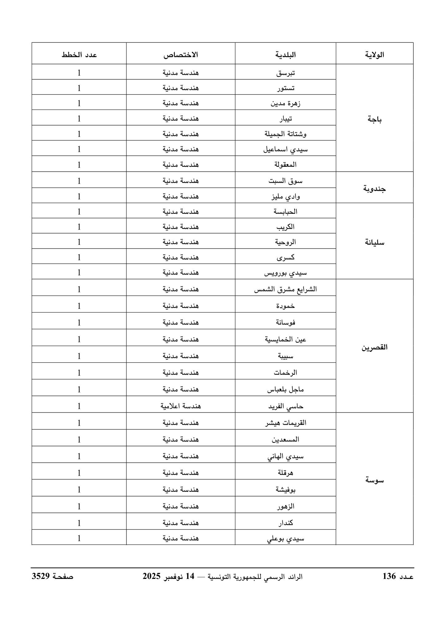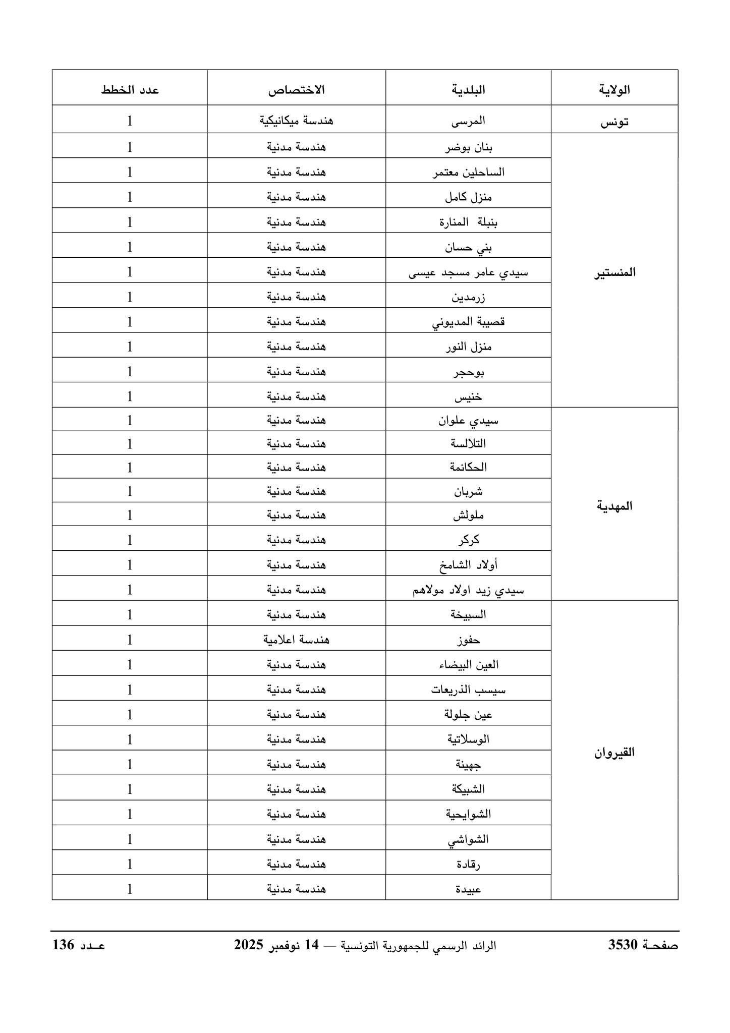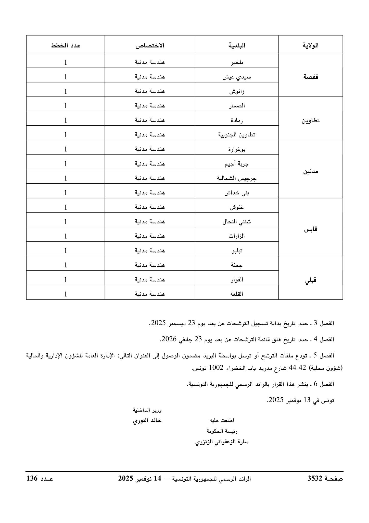 ورد بالرائد الرسمي للجمهورية التونسية الصادر يوم 14 نوفمبر 2025 قرار وزير الداخلية يتعلق بفتح مناظرة خارجية بالاختبارات لإنتداب مهندسين أول بالسلك المشترك لمهندسي الإدارات العمومية لفائدة بعض البلديات.
