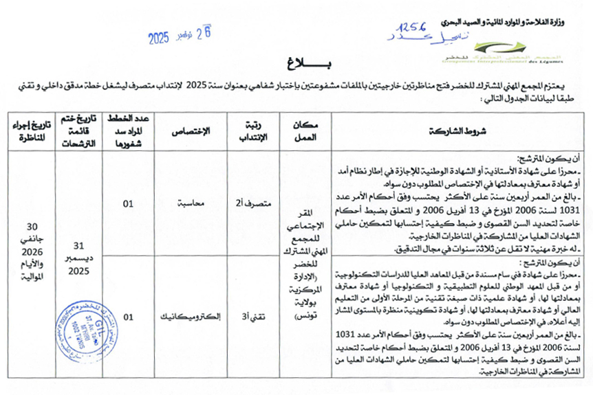 يعلم المجمع المهني المشترك للخضر عن فتح مناظرتين خارجيتين بالملفات بعنوان سنة 2025 مشفوعتين بإختبار شفاهي لإنتداب أعوان قارين.