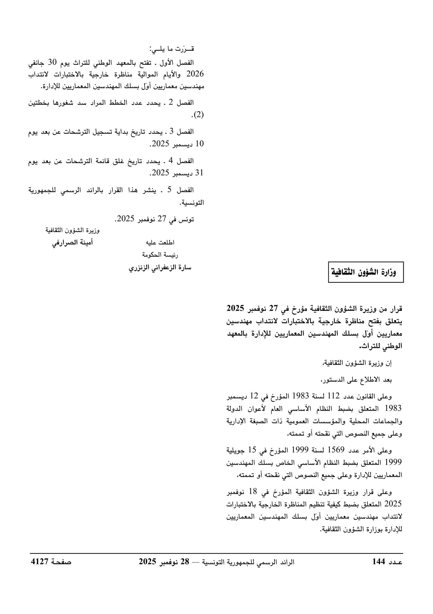 تعتزم وزارة الشؤون الثقافية فتح مناظرة خارجية بالاختبارات لانتداب مهندسين معماريين أول بالسلك المهندسين المعماريين للإدارة، وذلك حسب ماورد بقرار وزير الشؤون الثقافية المؤرخ في 27 نوفمبر 2025.