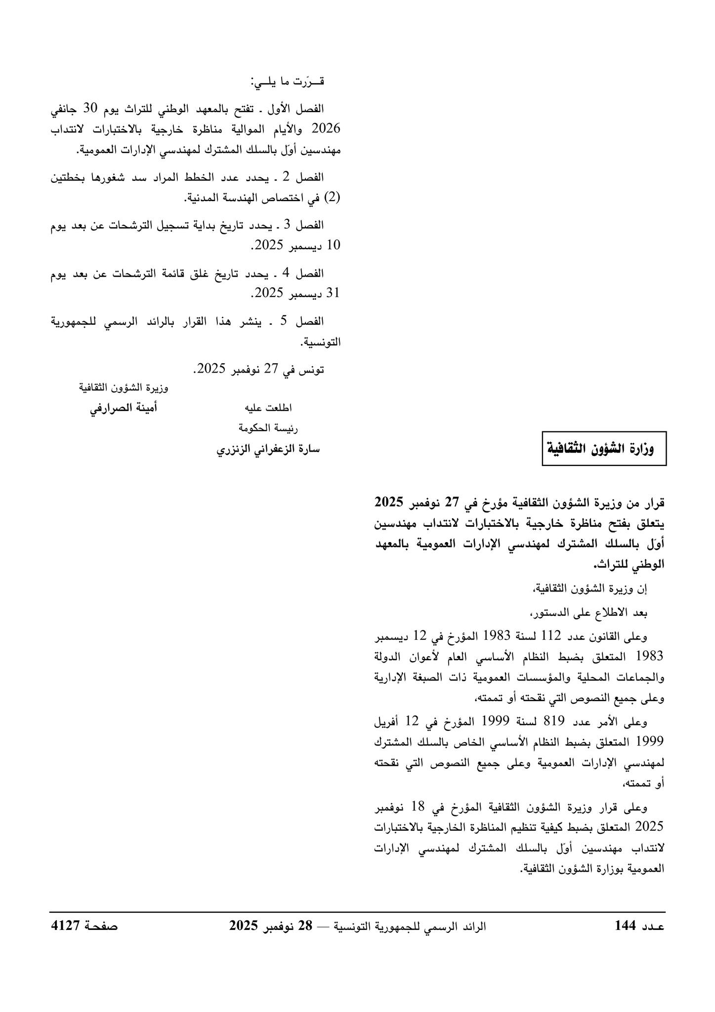 ورد بقرار وزير الشؤون الثقافية المؤرخ في 27 نوفمبر 2025، أن سيتم فتح مناظرة خارجية بالاختبارات لانتداب مهندسين أول بالسلك المشترك لمهندسي الإدارات العمومية بالمعهد الوطني للتراث.