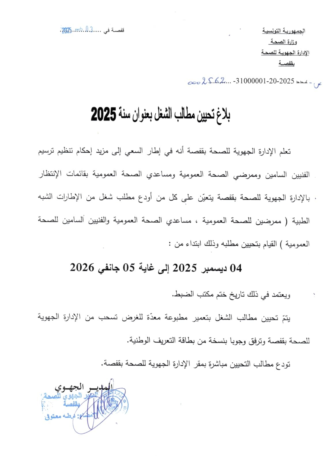 تعلم الإدارة الجهوية للصحة بقفصة أنه يتعين على كل من أودع مطلب شغل من الإطارات الشبه طبية (ممرضين، مساعدي الصحة العمومية والفنيين السامين للصحة العمومية) الذين أودعوا مطالب شغل للترسيم بقائمات الانتظار بالإدارة، تحيين مطالبهم بداية من 4 ديسمبر 2025 إلى غاية 5 جانفي 2026.
