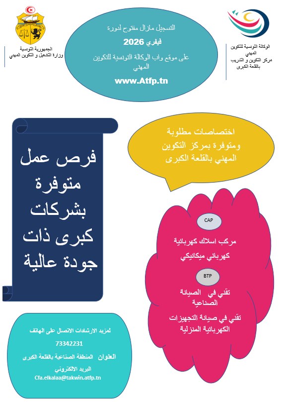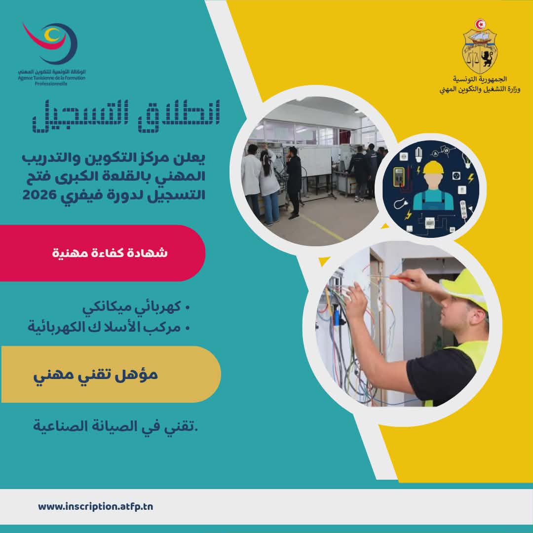 أعلنت إدارة مركز التكوين والتدريب المهني بالقلعة الكبرى عن فتح باب الترشح للتسجيل في للدورتين التكوينيتين فيفري وأفريل 2026.