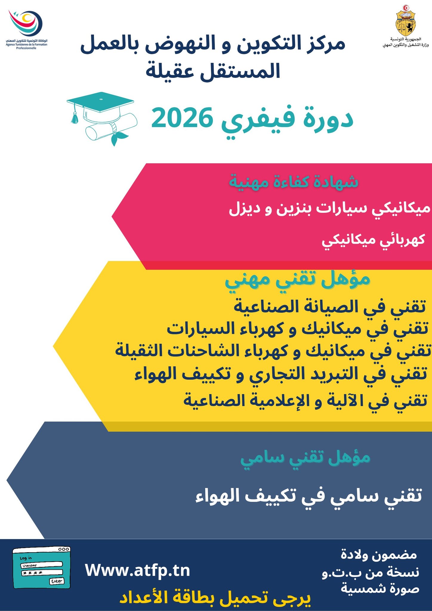 أعلن مركز التكوين والنهوض بالعمل المستقل العقيلة - قفصة عن فتح باب الترشح للتسجيل في الدورة التكوينية - دورة فيفري 2026.