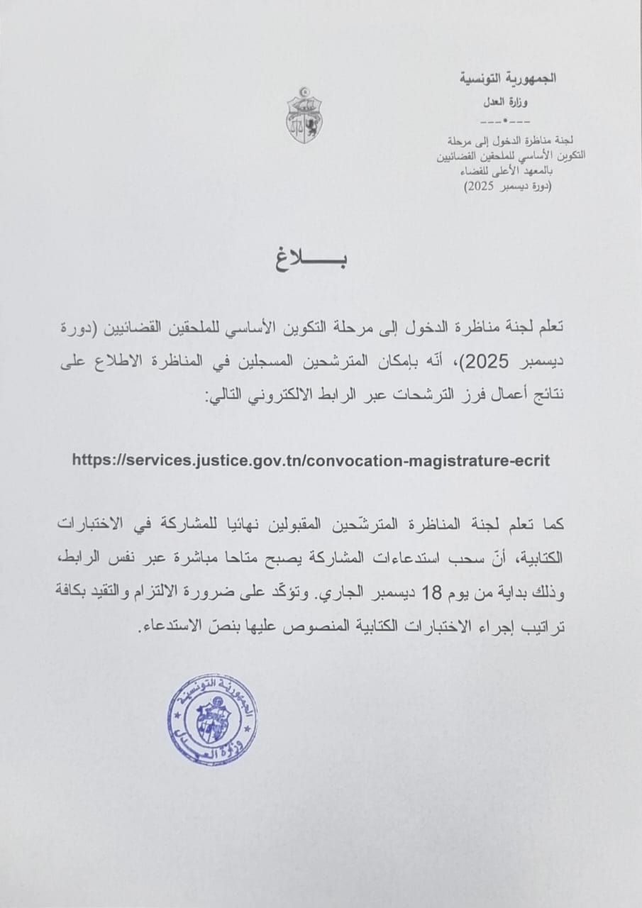 أعلنت لجنة مناظرة الدخول إلى مرحلة التكوين الأساسي للملحقين القضائيين (دورة ديسمبر 2025) عن نتائج أعمال فرز الترشحات عبر الرابط المرفق.
