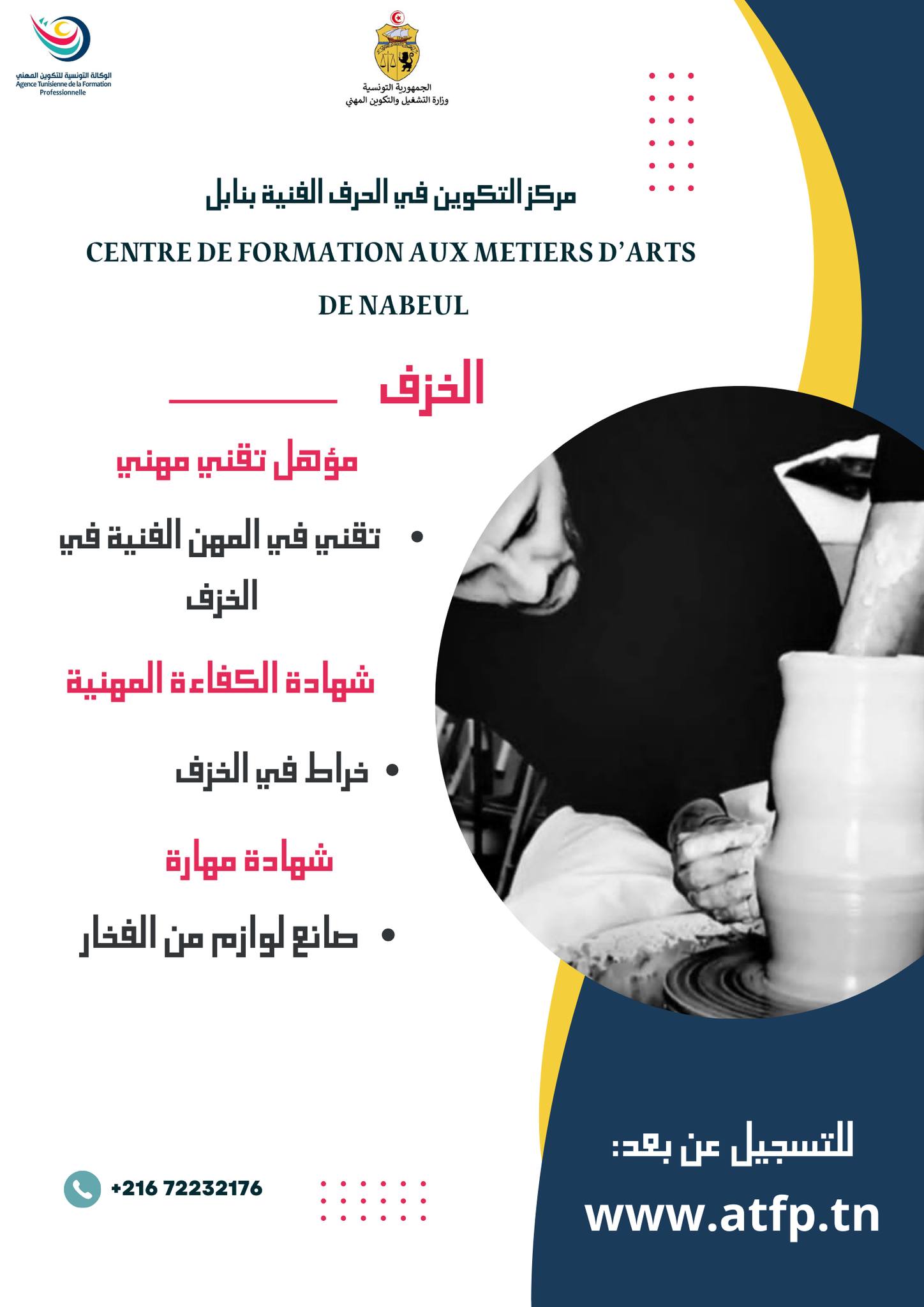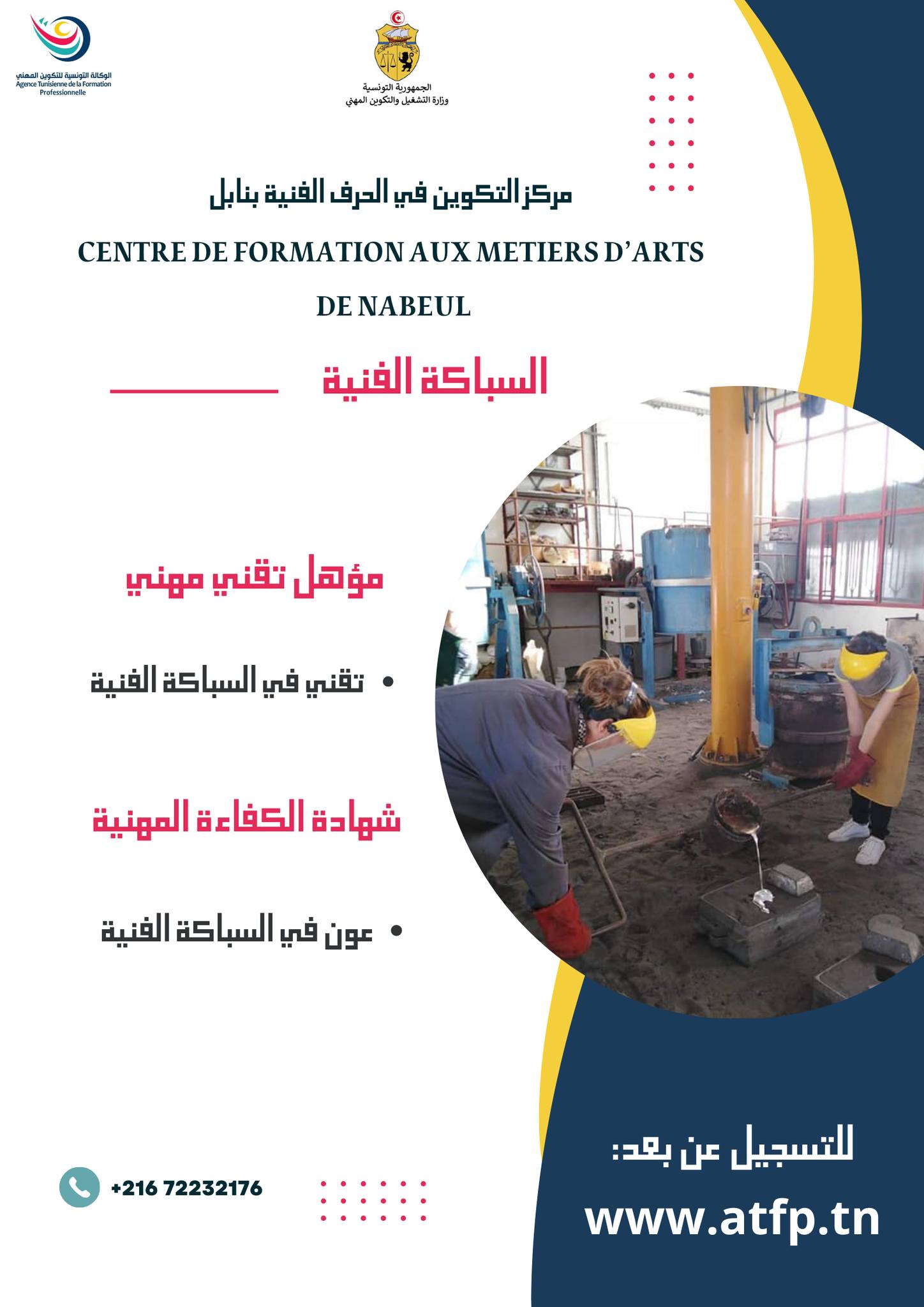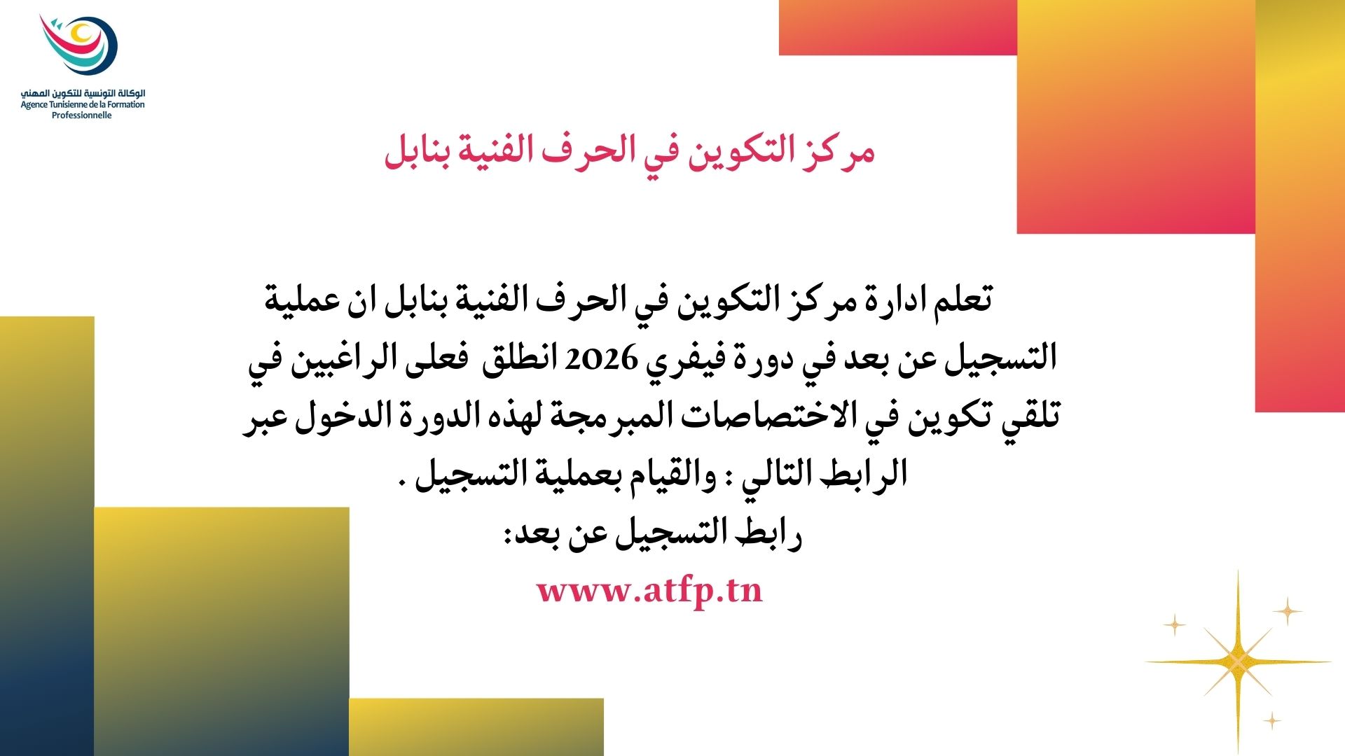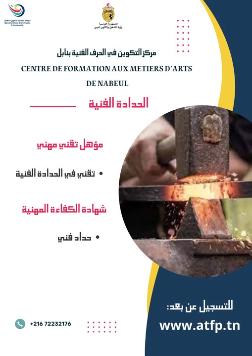 تعلم إدارة مركز التكوين في الحرف الفنية بنابل عن فتح باب التسجيل للإلتحاق بدورة فيفري 2026 في الإختصاصات التالية :