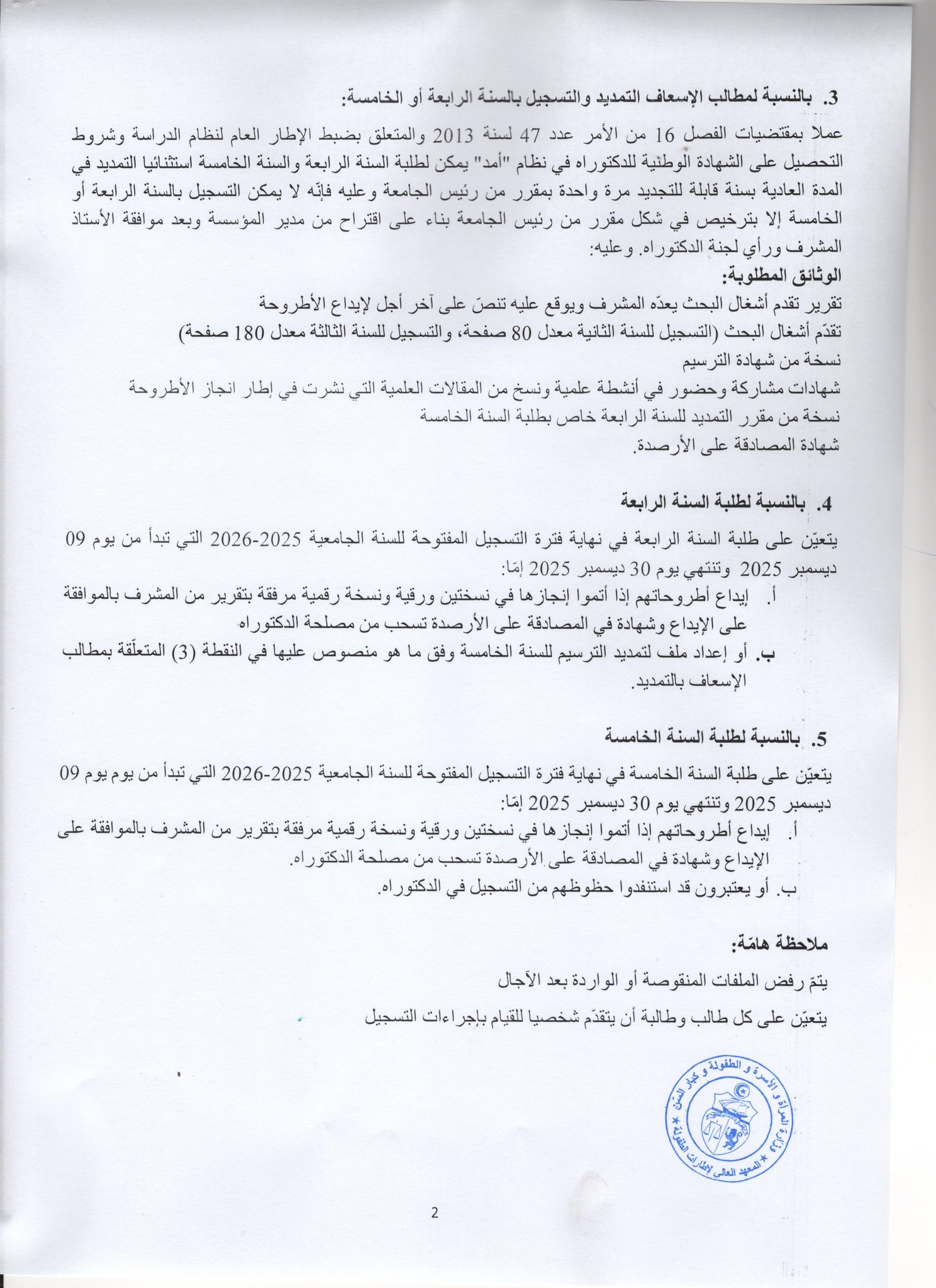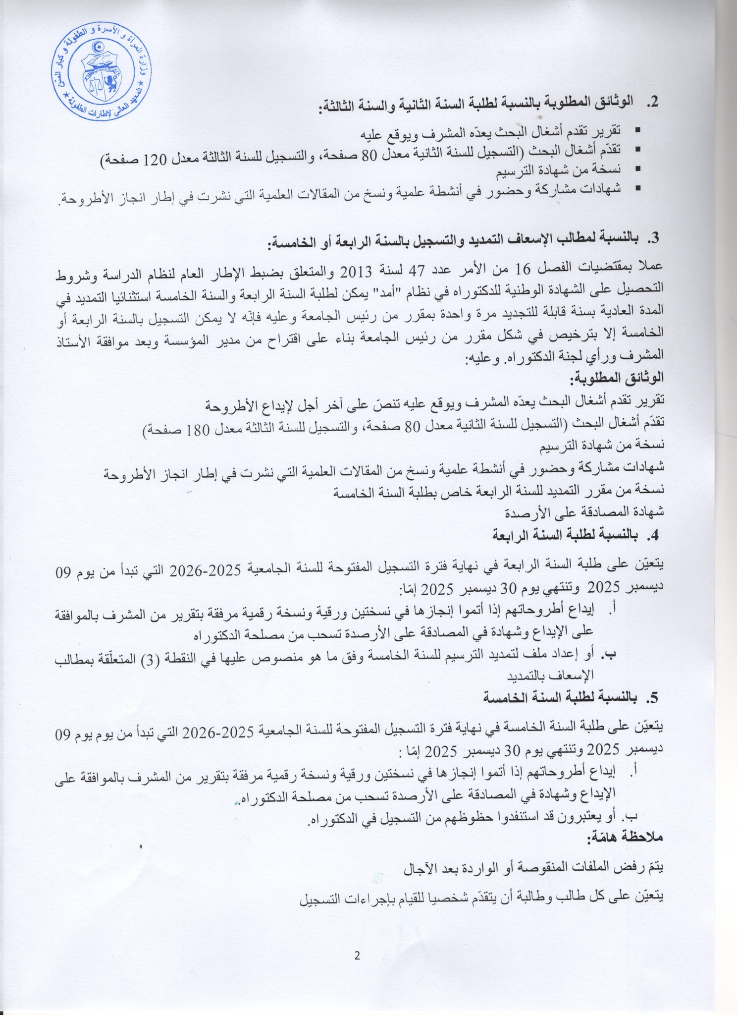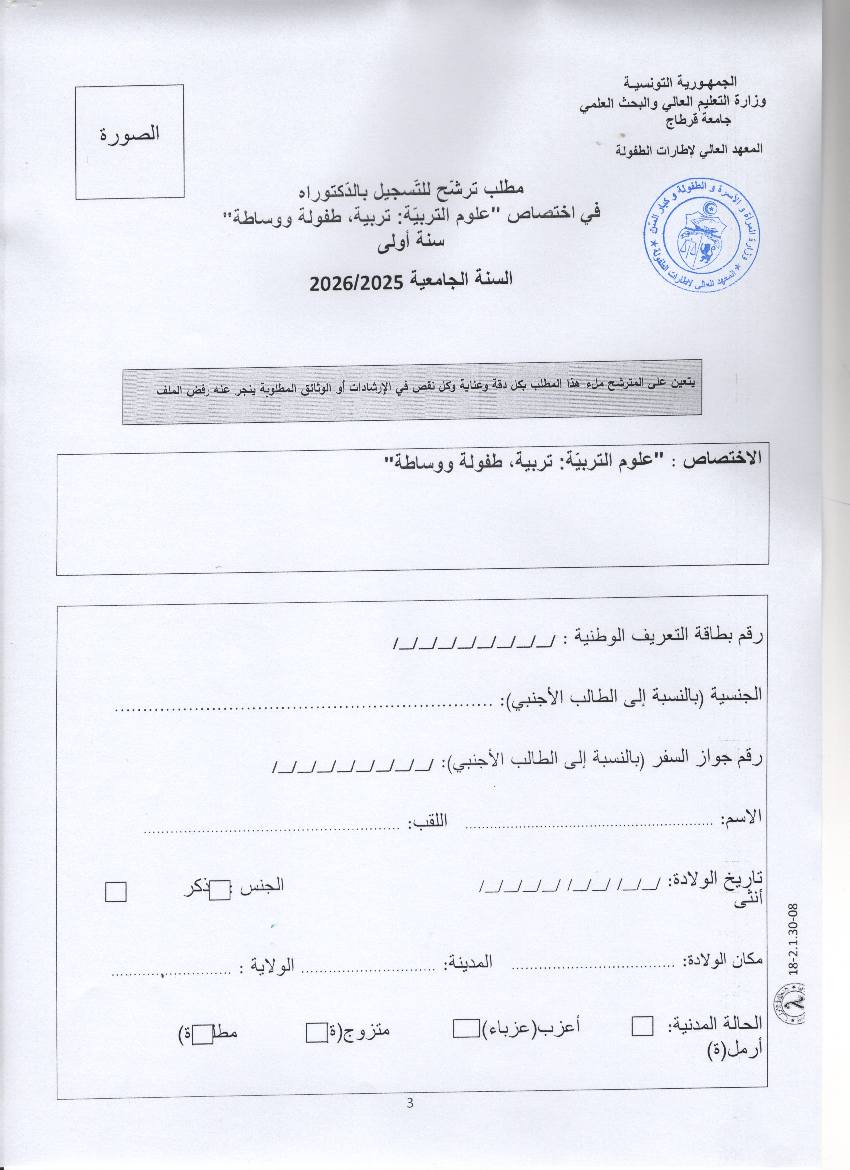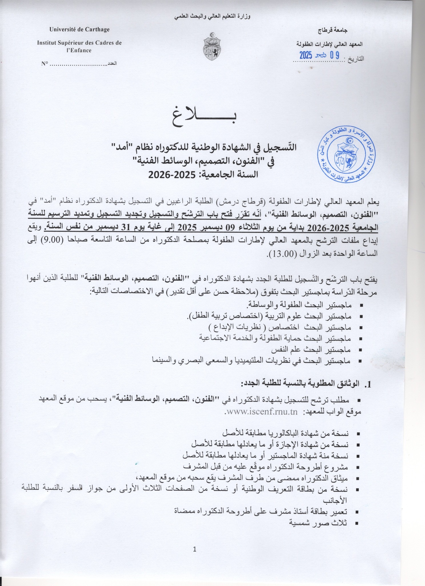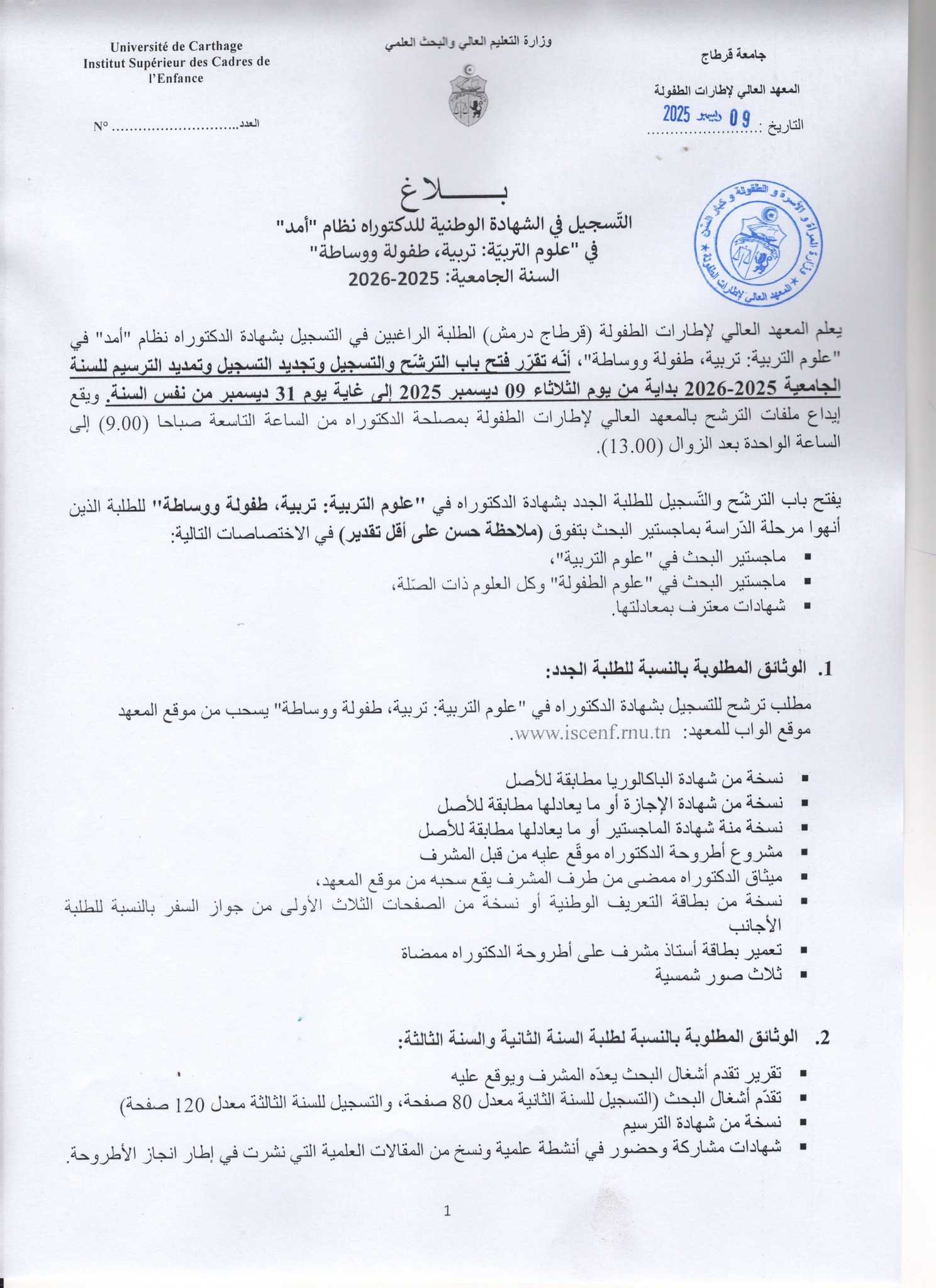 يتعين على الطلبة الراغبين في التسجيل في شهادة الدكتوراه إيداع ملفات ترشحهم متضمنة كامل الوثائق المطلوبة مباشرة بمصلحة الدكتوراه بالمعهد العالي لإطارات الطفولة بقرطاج درمش بداية من 9 ديسمبر إلى غاية 31 ديسمبر 2025.