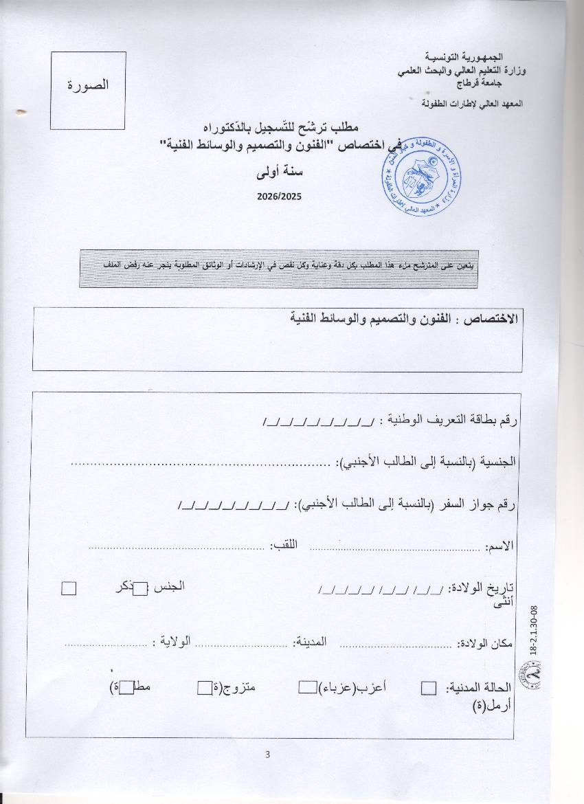 أعلن المعهد العالي لإطارات الطفولة بقرطاج درمش عن فتح باب الترشح والتسجيل وتجديد التسجيل وتمديد الترسيم بشهادة الدكتوراه بعنوان السنة الجامعية 2025-2026 في الاختصاصات التالية :