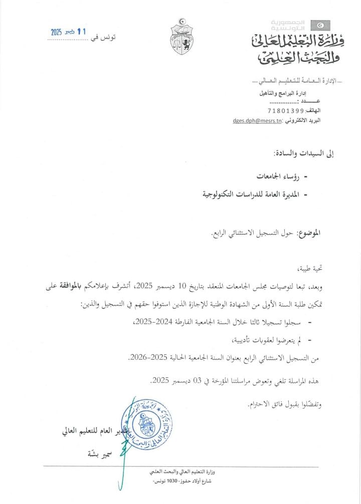 انعقد مجلس الجامعات يوم 10 ديسمبر 2025 حيث تمت الموافقة على تمكين طلبة السنة الأولى من الشهادة الوطنية للإجازة الذين استوفوا حقهم في التسجيل والذين :