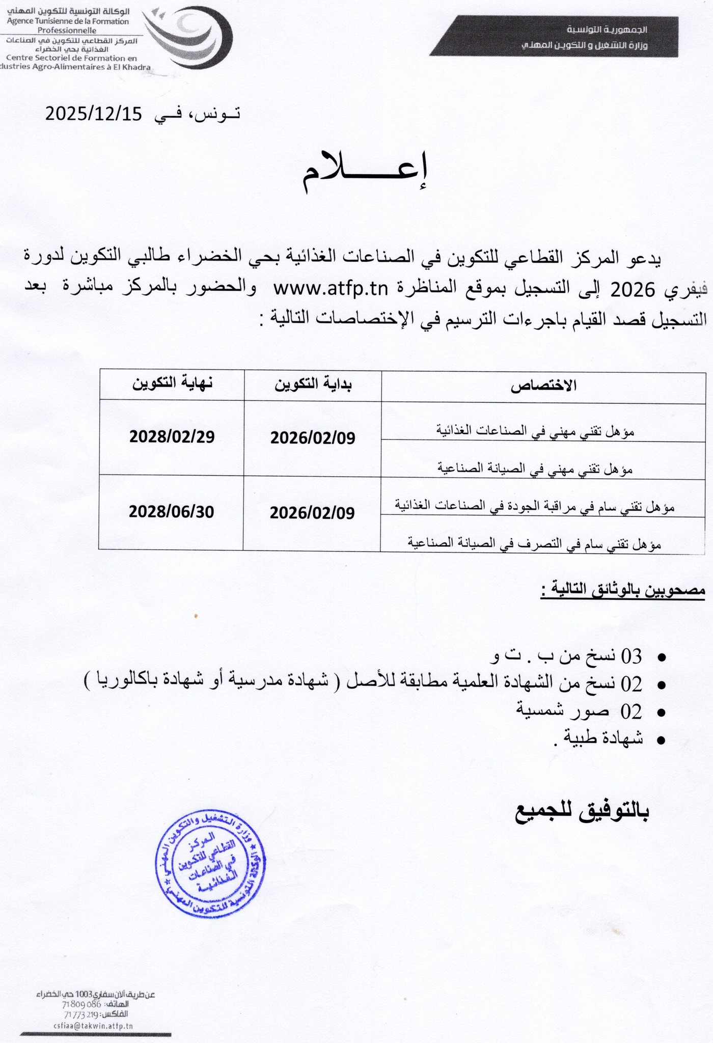 أعلنت المركز القطاعي للتكوين في الصناعات الغذائية بحي الخضراء عن فتح باب التسجيل عن بعد للإلتحاق بالدورة التكوينية لدورة فيفري 2026.