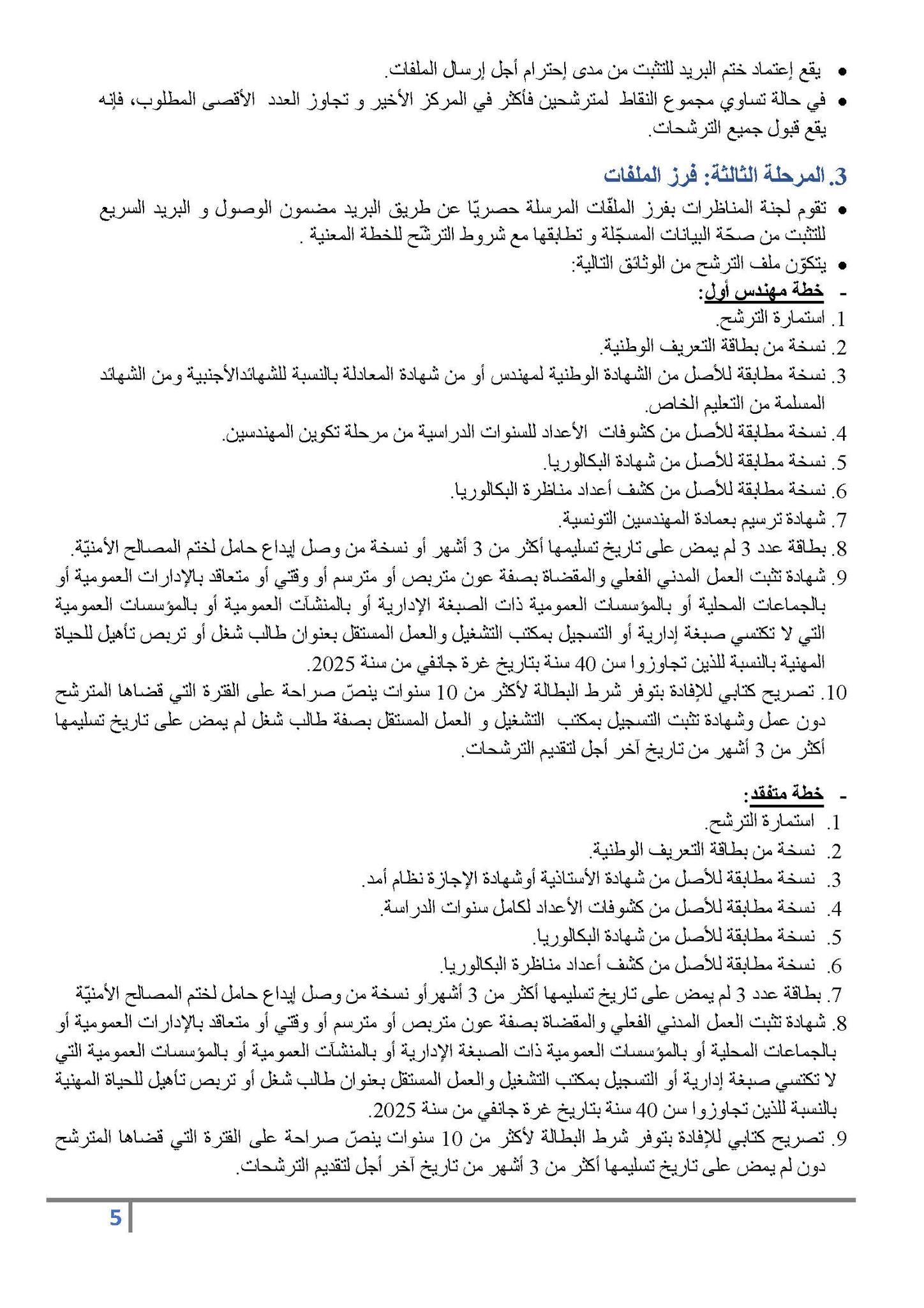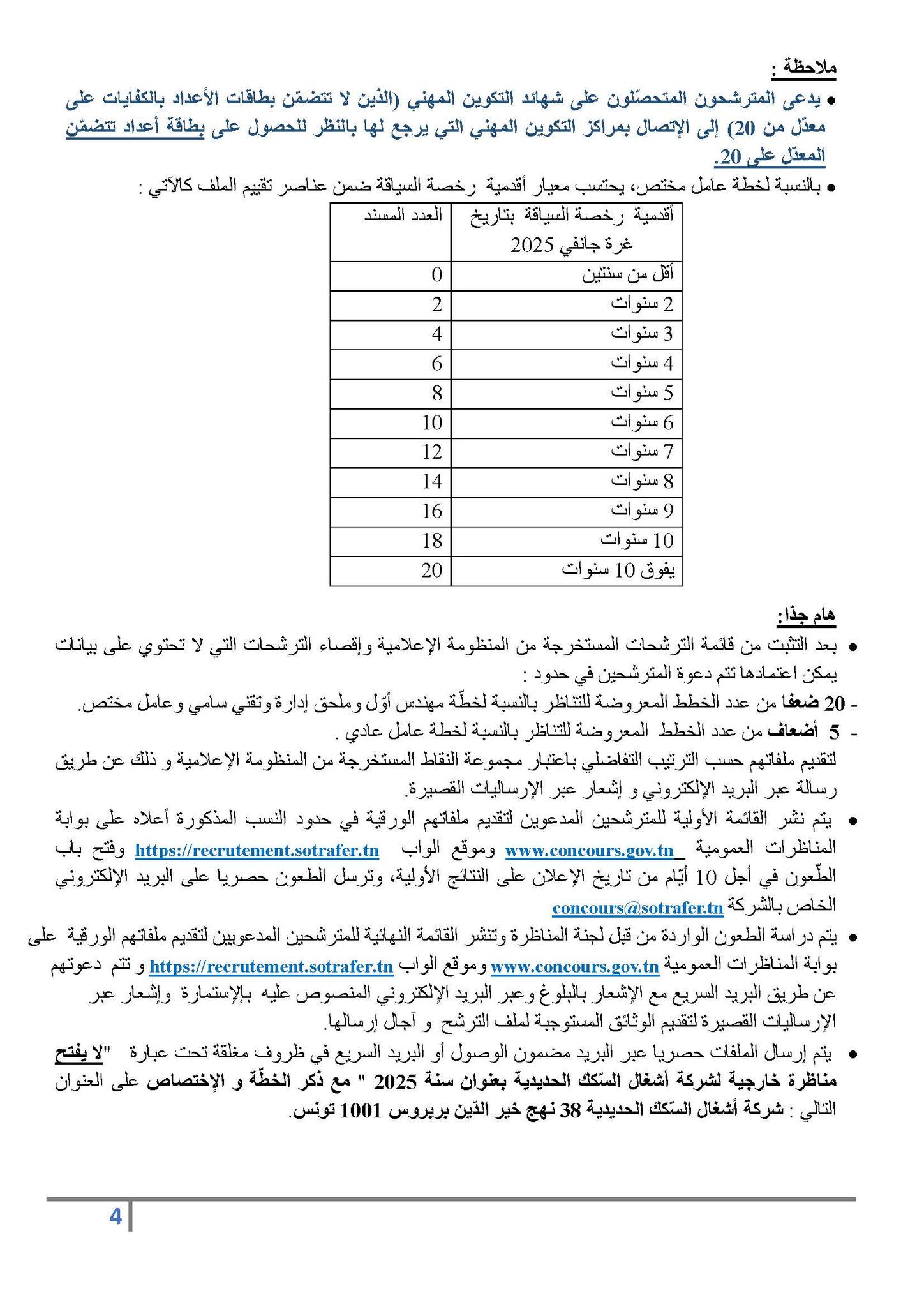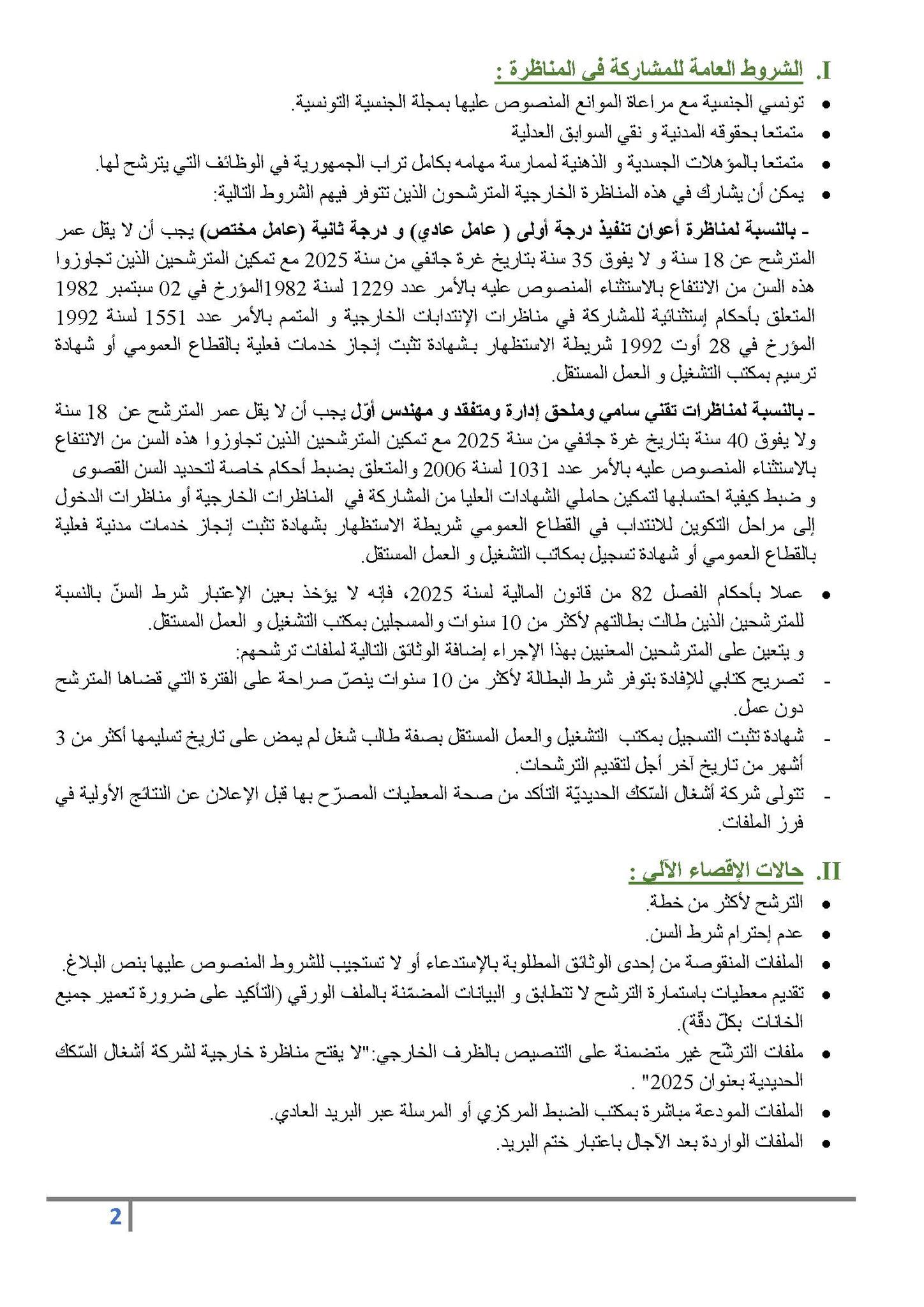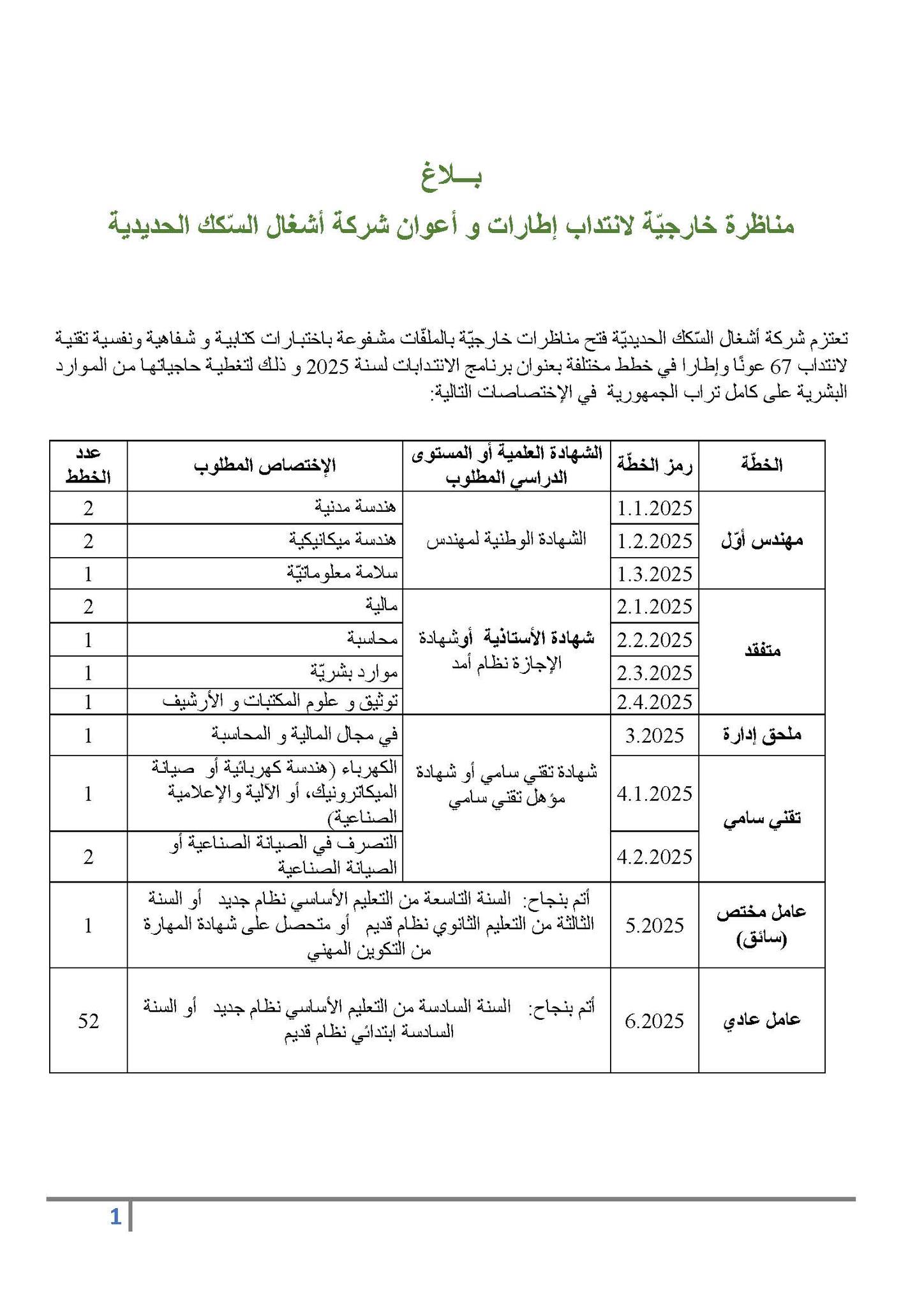 تعلم شركة أشغال السكك الحديدية عن فتح مناظرات خارجية بالملفات مشفوعة باختبارات كتابية وشفاهية ونفسية تقنية لانتداب (67 خطة) عون وإطار في خطط مختلفة بعنوان برنامج الإنتدابات لسنة 2025.