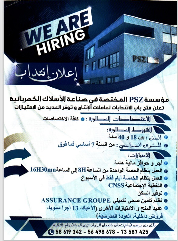 يعلم مكتب التشغيل والعمل المستقل بمدنين أن مؤسسة PSZ المختصة في صناعة الأسلاك الكهربائية تعتزم فتح باب الإنتدابات لعاملات الإنتاج.