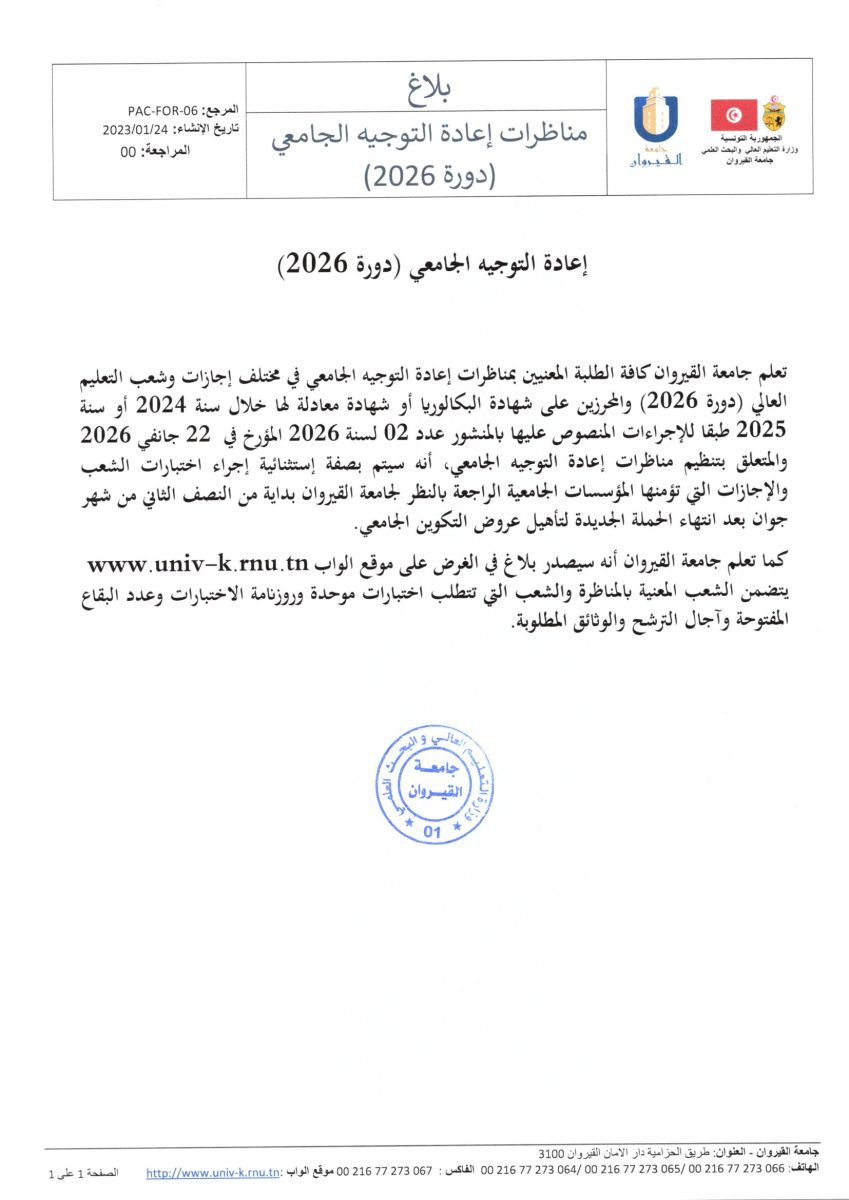 أعلنت جامعة القيروان في بلاغ صادر لها يوم الجمعة 30 جانفي 2026، كافة الطلبة المعنيين بمناظرات إعادة التوجيه الجامعي في مختلف إجازات وشعب التعليم العالي (دورة 2026) والمحرزين على شهادة البكالوريا أو شهادة معادلة لها خلال سنة 2024أو سنة 2025.