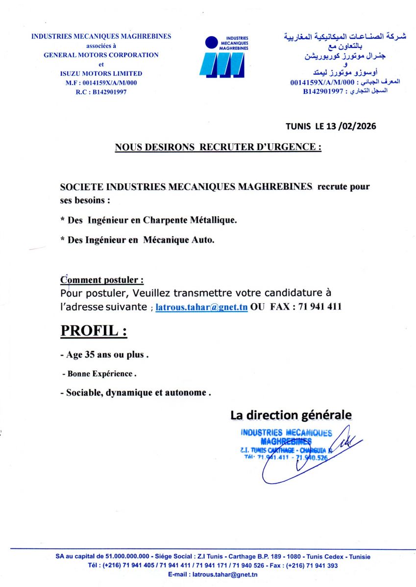 تعلم شركة الصناعات الميكانيكية المغاربيةبالتعاون مع جنرال موتورز كوربوريشنوأوسوزو موتورز ليمتد عن فتح باب الترشح لانتداب مهندسين.