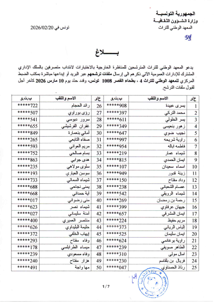 نتائج الفرز الأولي لمناظرة إنتداب متصرفين - المعهد الوطني للتراث