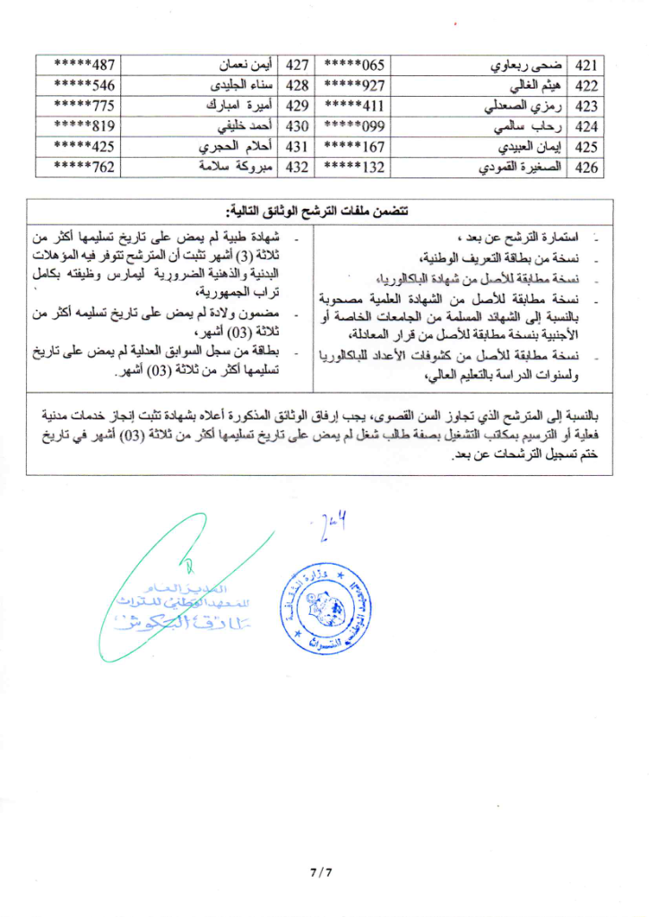 يتعين على المترشحين المذكورة أسماؤهم بالقائمة المرفقة تقديم ملفات ترشحهم متضمنة كامل الوثائق المطلوبة مباشرة بمكتب الضبط المركزي للمعهد أو إرسالها عبر البريد على العنوان التالي :