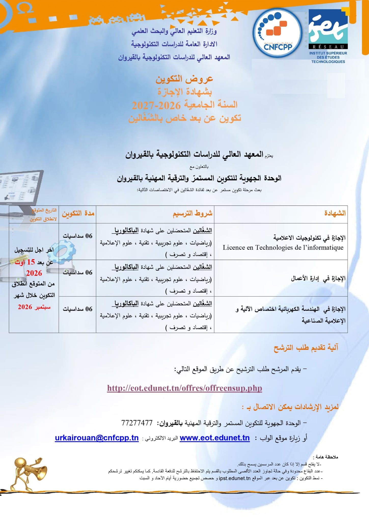 بالتعاون مع الوحدة الجهوية للتكوين المستمر والترقية المهنية بالقـيروان، يعتزم المعهد العالي للدراسات التكنولوجية بالقيروان بعث مرحلة تكوين مستمر عن بعد لفائدة الشغالين في عدد من الاختصاصات.
