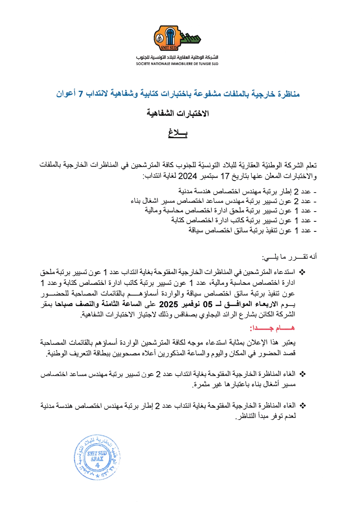 تعلم الشركة الوطنية العقارية للبلاد التونسية للجنوب كافة المترشحين في المناظرات الخارجية بالملفات والاختبارات المعلن عنها بتاريخ 17 سبتمبر 2024 لانتداب (07 خطط) أعوان.
