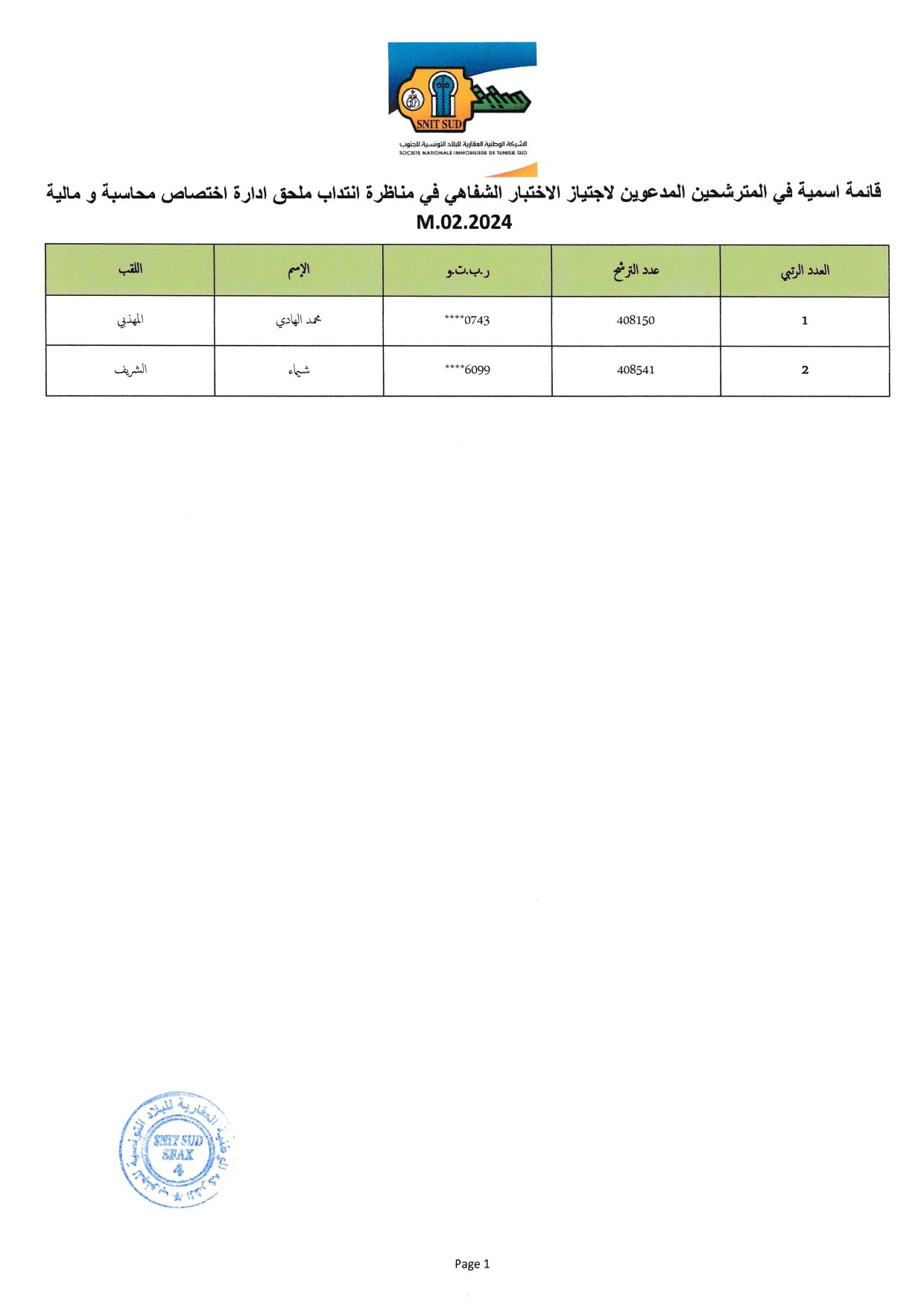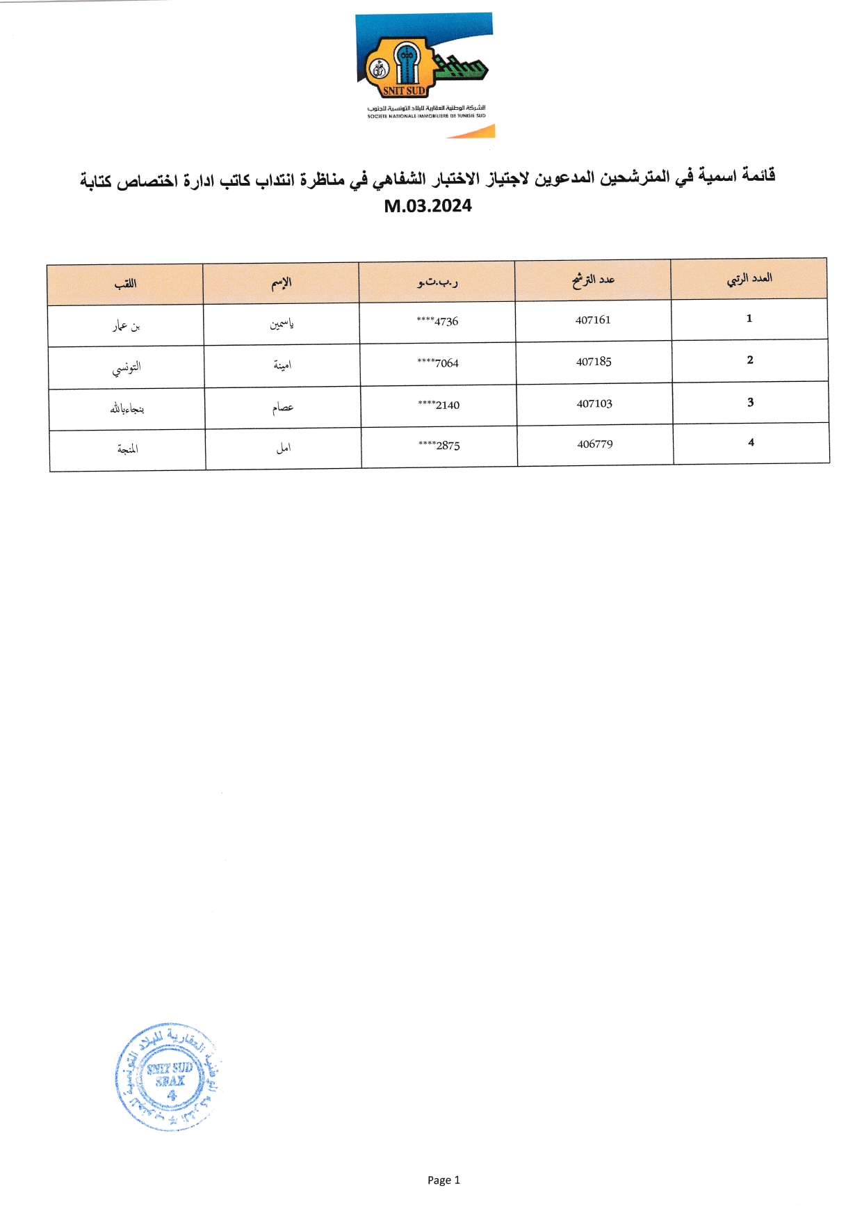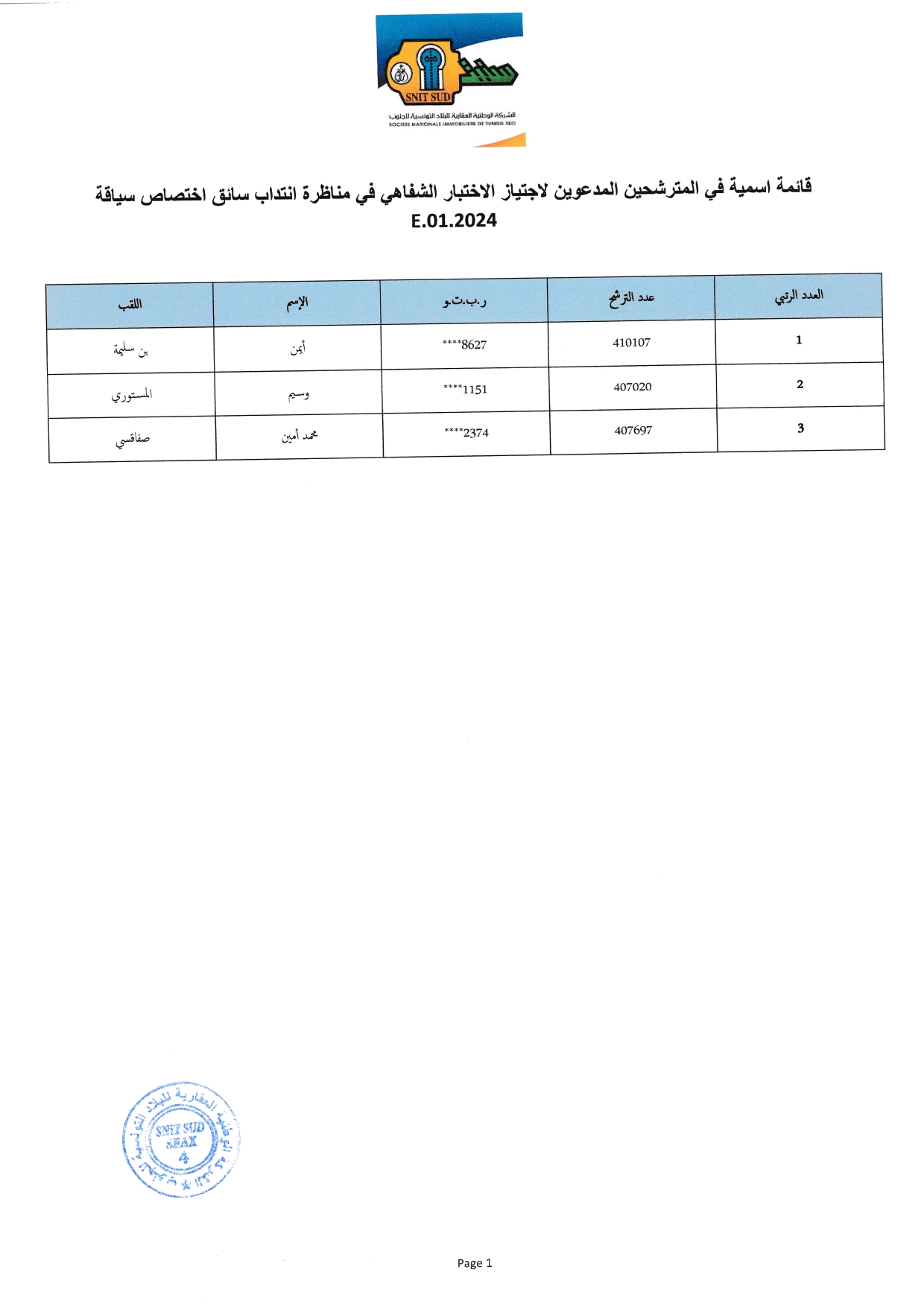 والواردة أسماؤهم بالقائمات المرفقة إلى الحضور يوم الإربعاء 5 نوفمبر 2025 على الساعة الثامنة صباحا (8h:00) بمقر الشركة الكائن بشارع الرائد البجاوي بصفاقس وذاك لاجتياز الاختبارات الشفاهية .