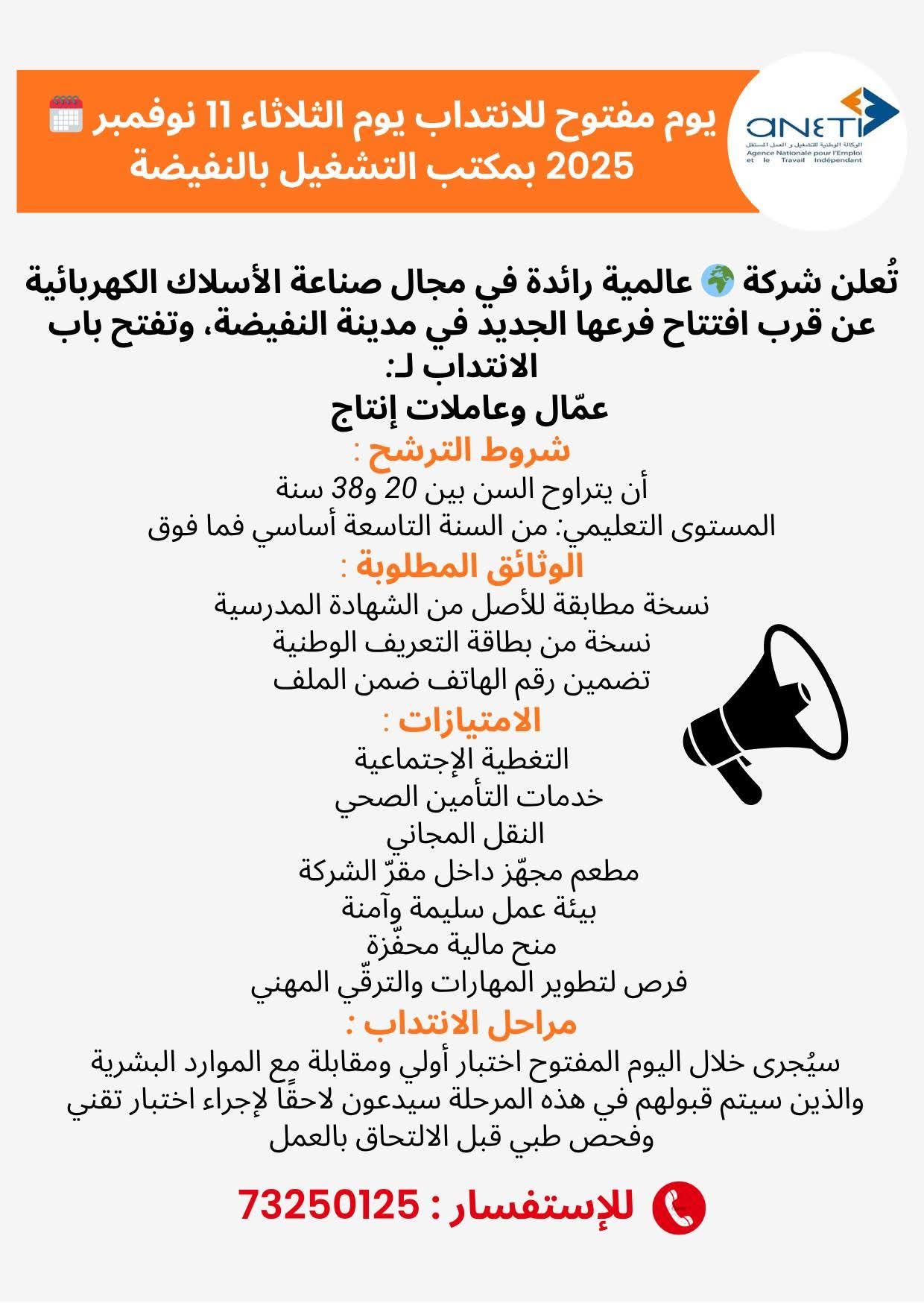 يعلم مكتب التشغيل بالنفيضة أن شركة عالمية رائدة في مجال صناعة الأسلاك الكهربائية تعتزم افتتاح فرعها الجديد في مدينة النفيصة.