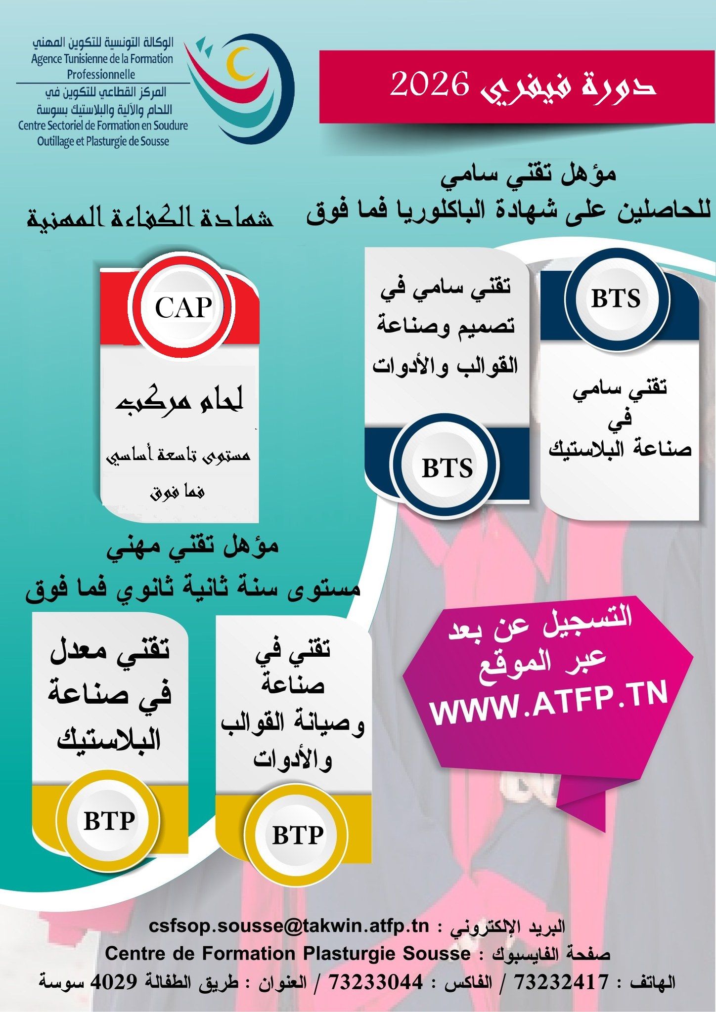 أعلن المركز القطاعي للتكوين في اللحام والآلية والبلاستيك بسوسة عن فتح باب التسجيل لدورة فيفري 2026.