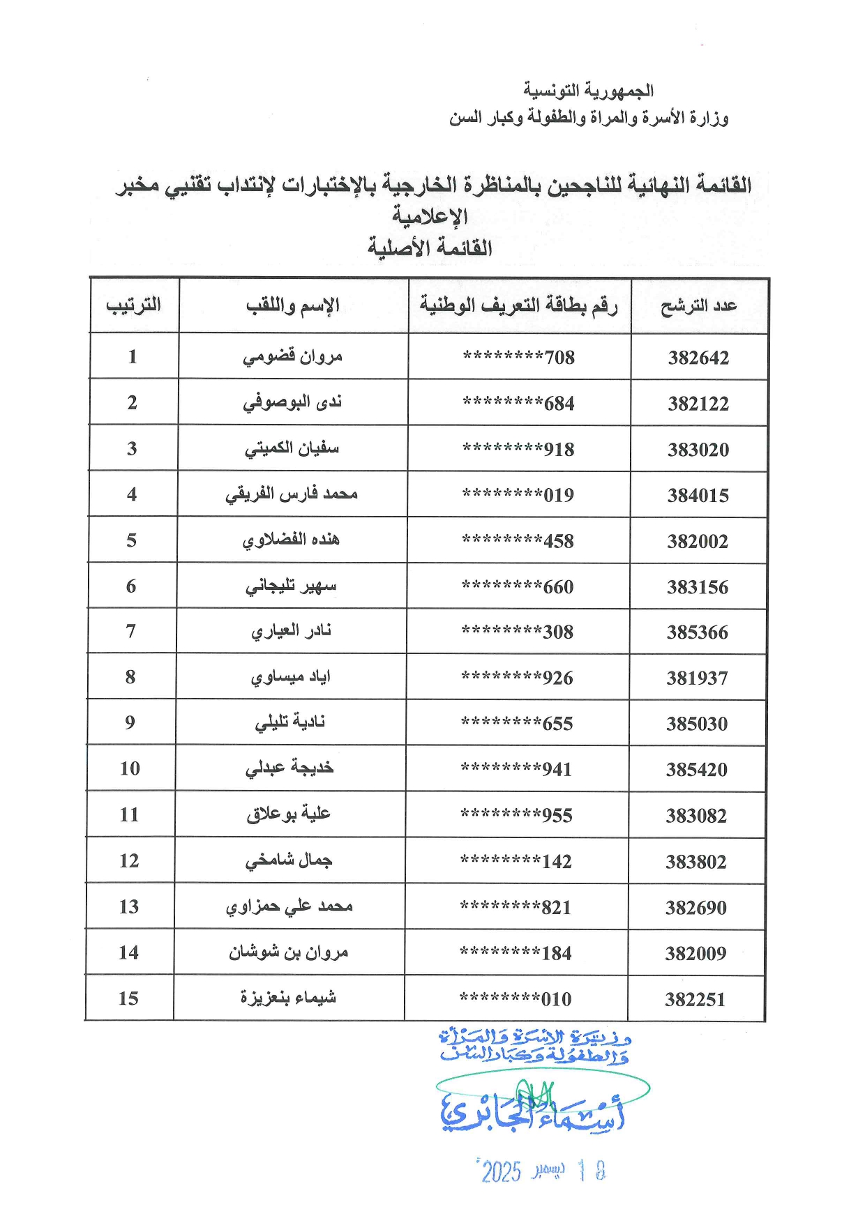 نشرت وزارة الأسرة والمرأة والطفولة وكبار السن القائمة النهائية للناجحين بالمناظرة الخارجية بالاختبارات لانتداب تقنيي مخبر الإعلامية بسلك محللي وتقنيي الإعلامية للإدارات العمومية.