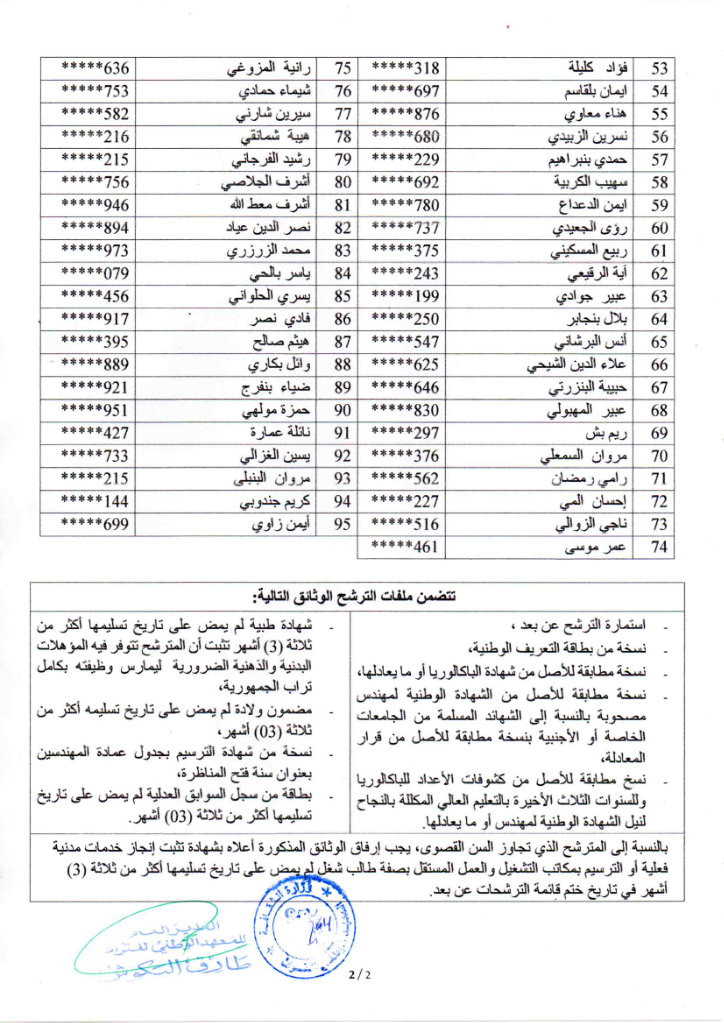 يتعين على المترشحين المذكورة أسماؤهم بالقائمة المرفقة تقديم ملفات ترشحهم متضمنة كامل الوثائق المطلوبة مباشرة بمكتب الضبط المركزي للمعهد أو إرسالها عبر البريد على العنوان التالي :