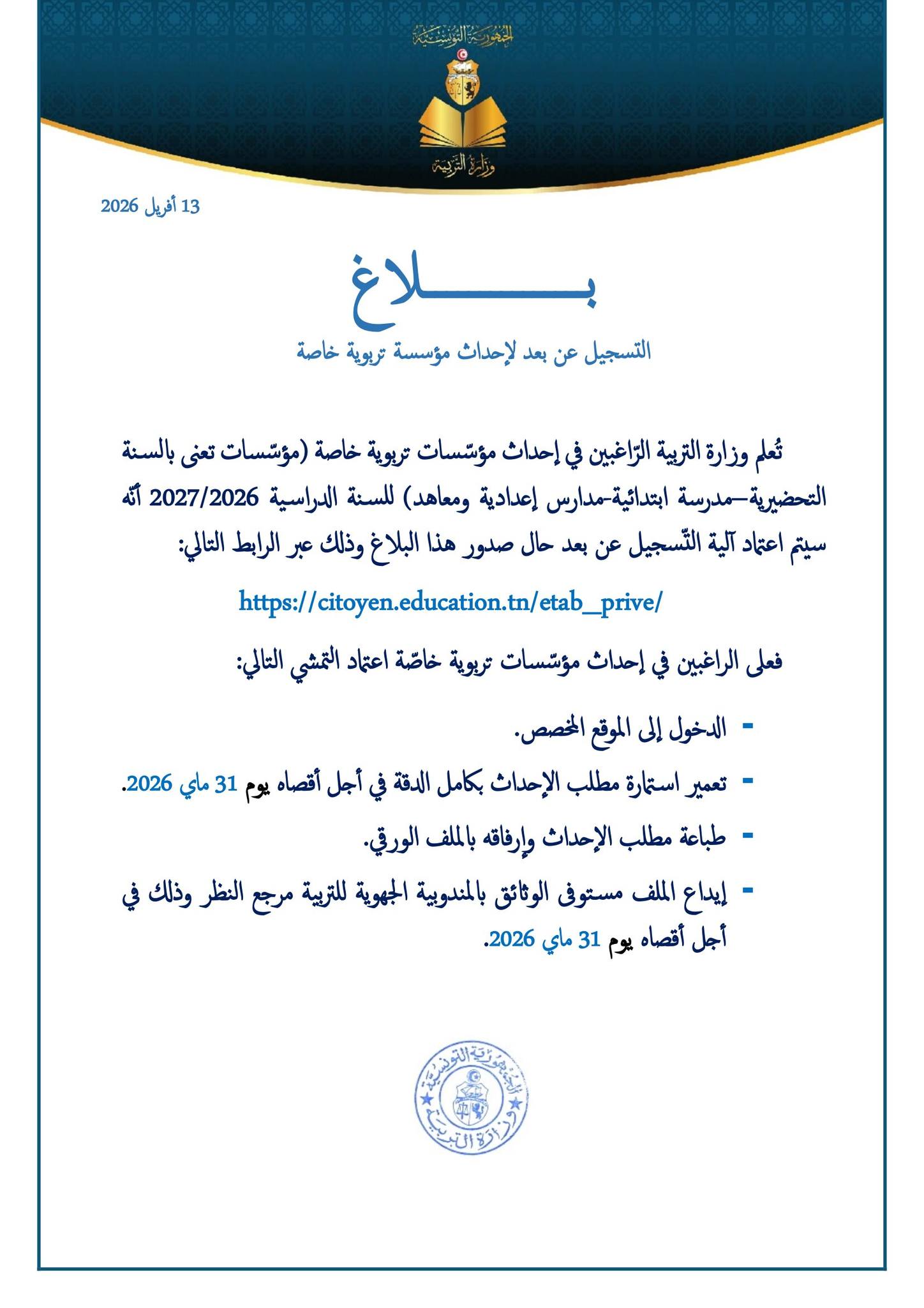 أعلنت وزارة التربية أنه سيتم اعتماد آلية التسجيل عن بعد للراغبين في إحداث مؤسسات تربوية خاصة (مؤسسات تعنى بالسنة التحضيرية - مدرسة إبتدائية - مدارس إعدادية ومعاهد) للسنة الدراسية 2026-2027.
