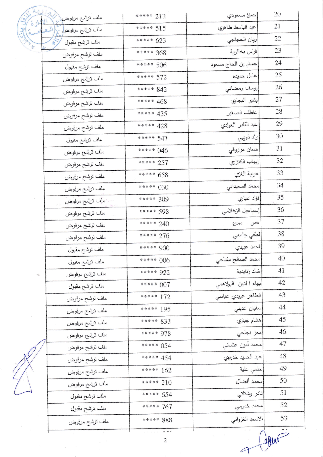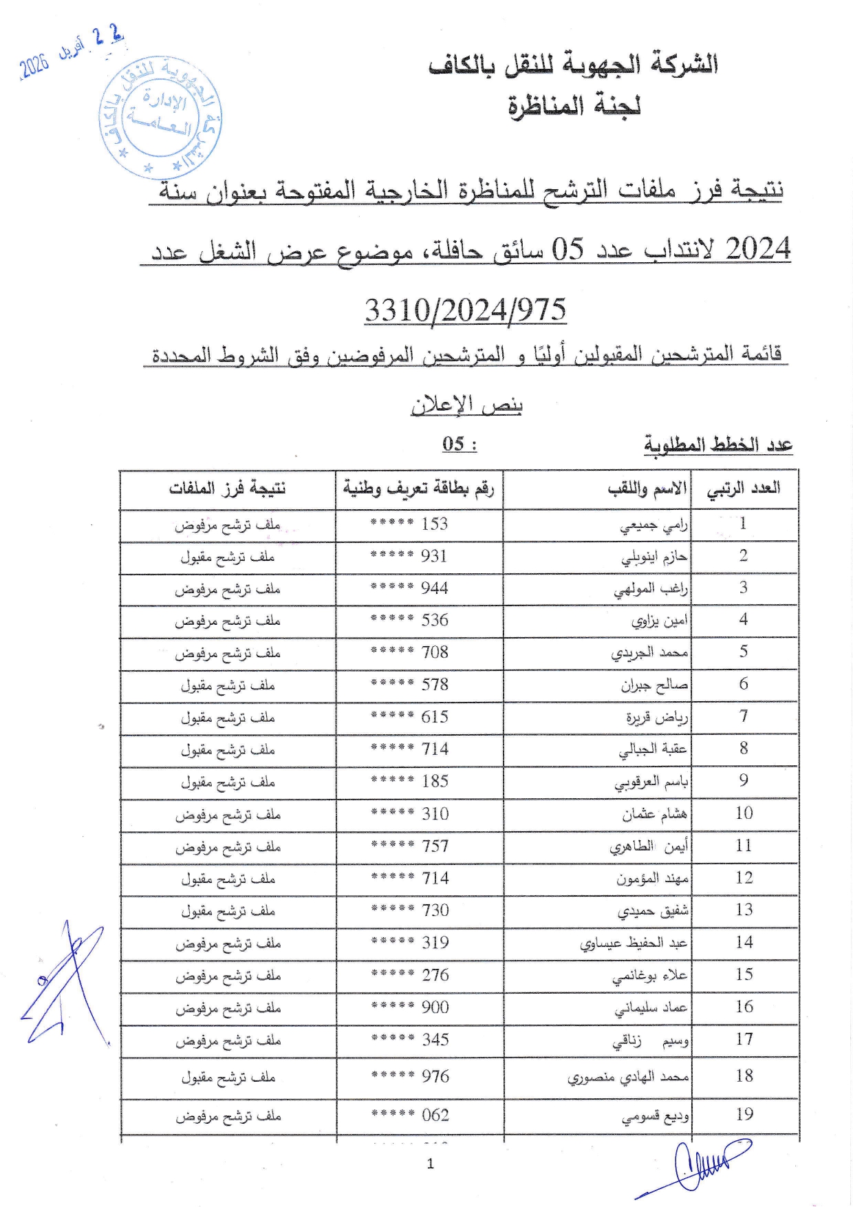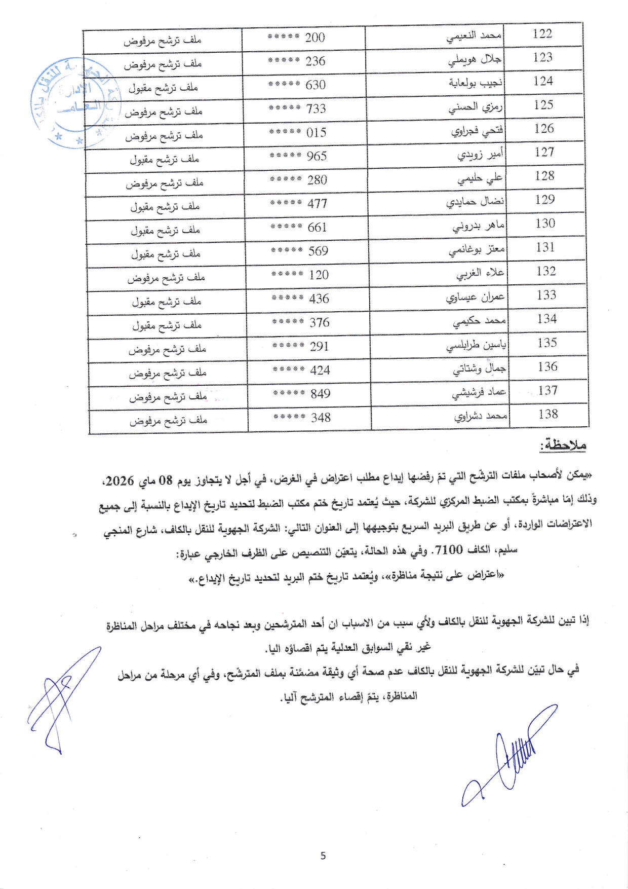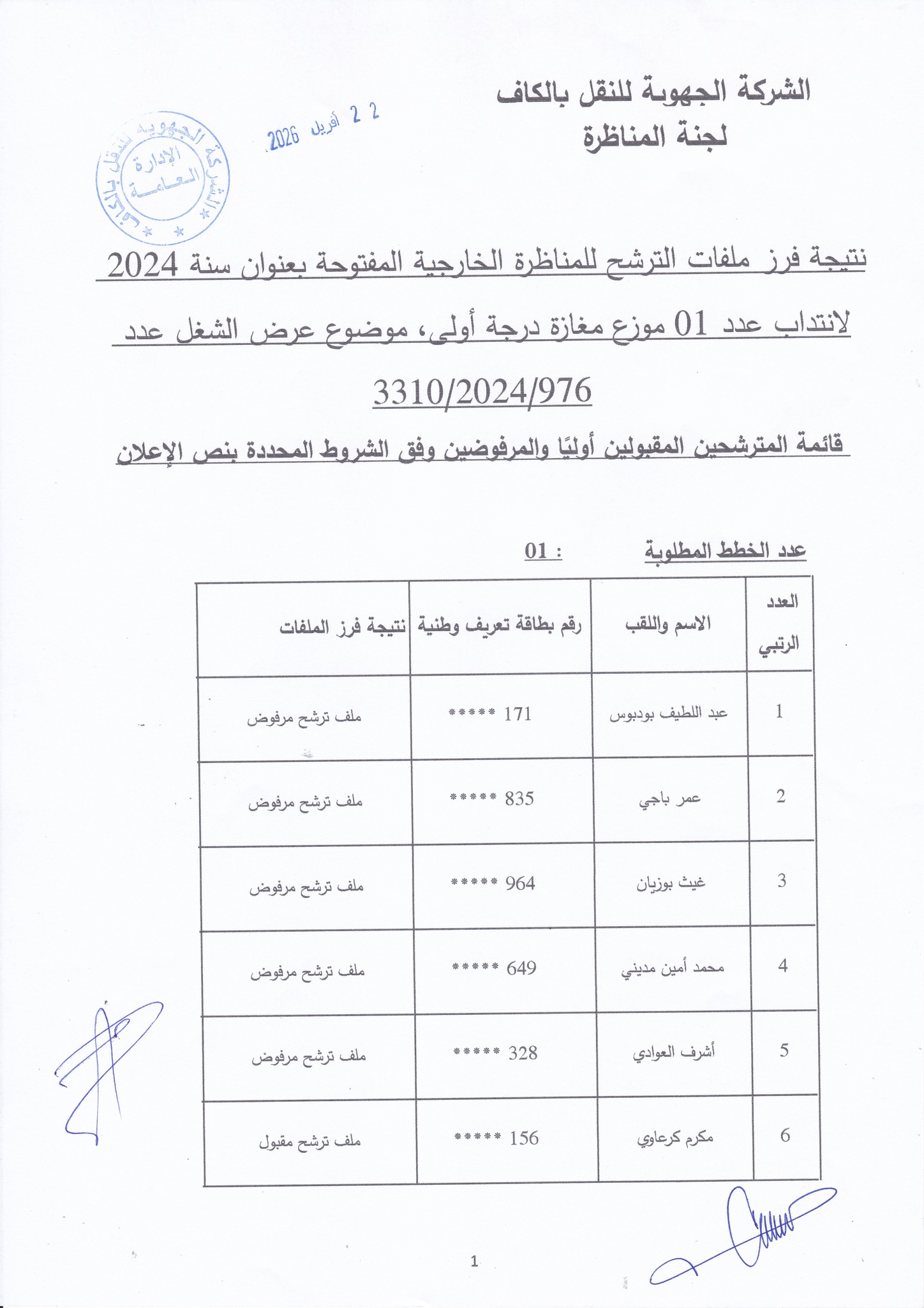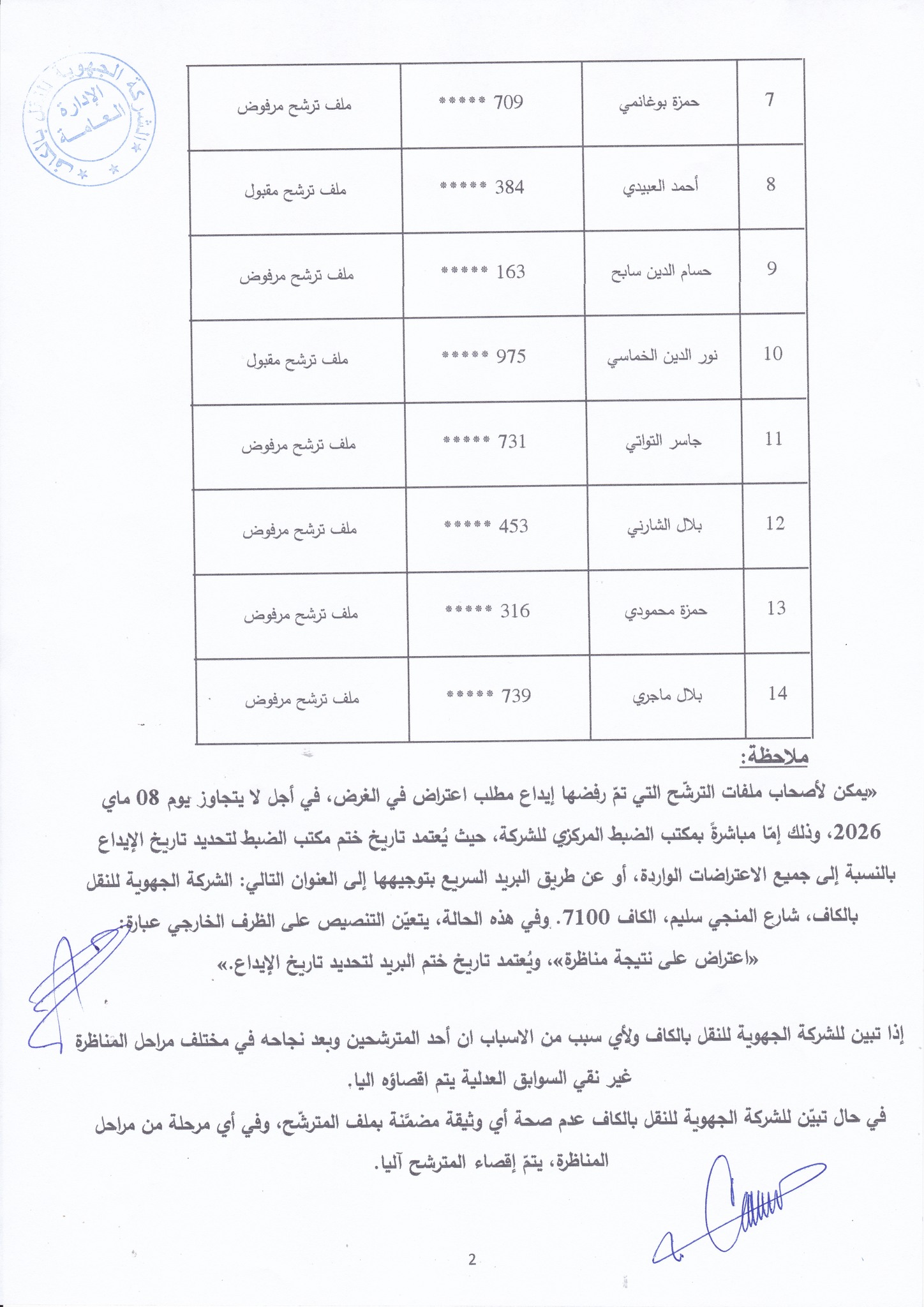 نتائج فرز ملفات الترشح لمناظرة الشركة الجهوية للنقل بالكاف لانتداب أعوان