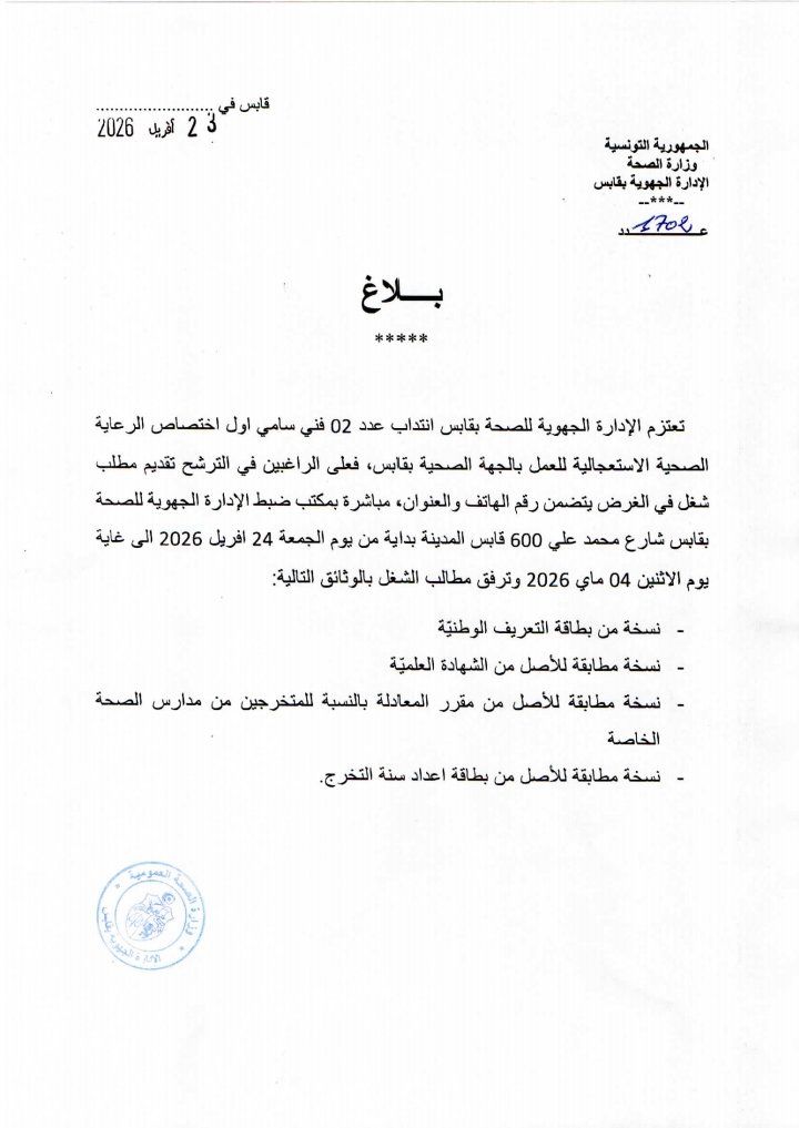 أعلنت الإدارة الجهوية للصحة بقابس عن فتح باب الترشح لإنتداب (02 خطتان) فني سامي أول اختصاص الرعاية الصحية الإستعجالية.