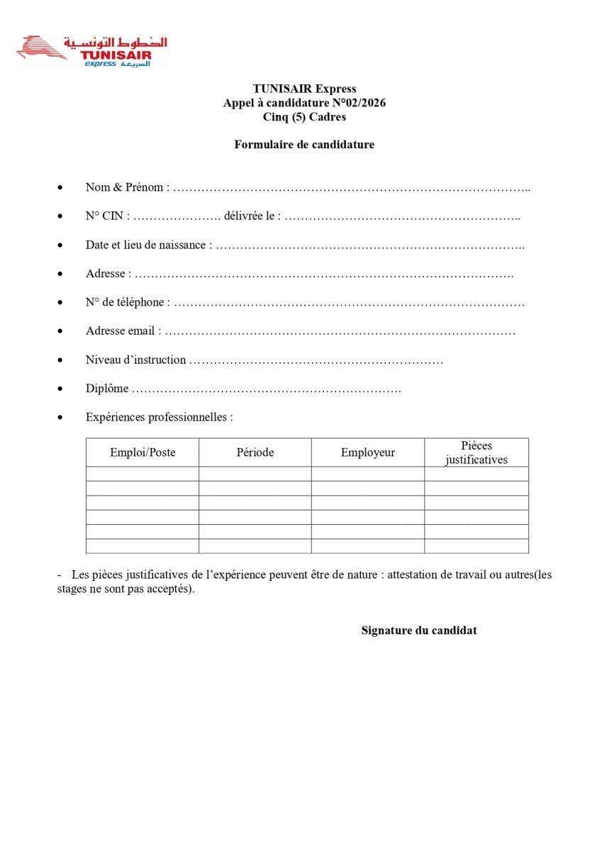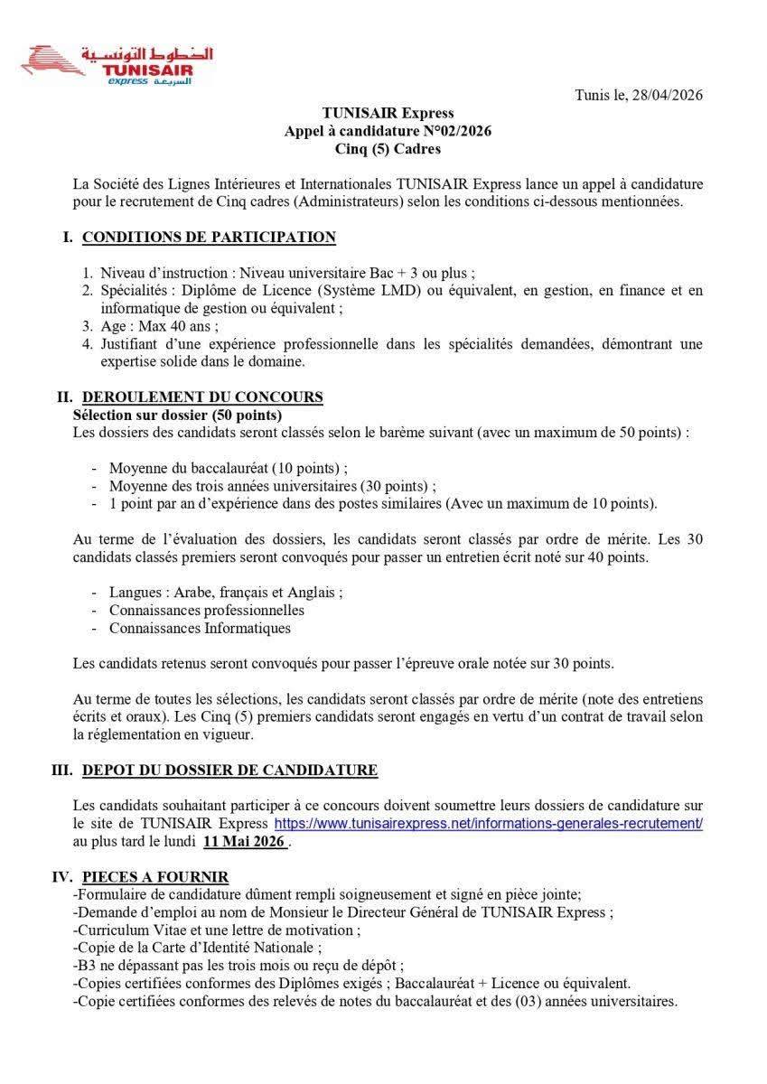 أعلنت الخطوط التونسية السريعة (Tunisair Express) عن فتح باب الترشح لإنتداب (05 خطط) إطارات.