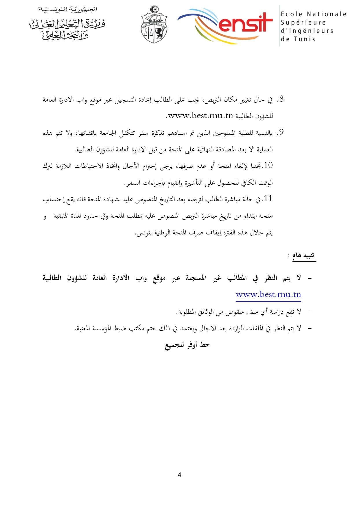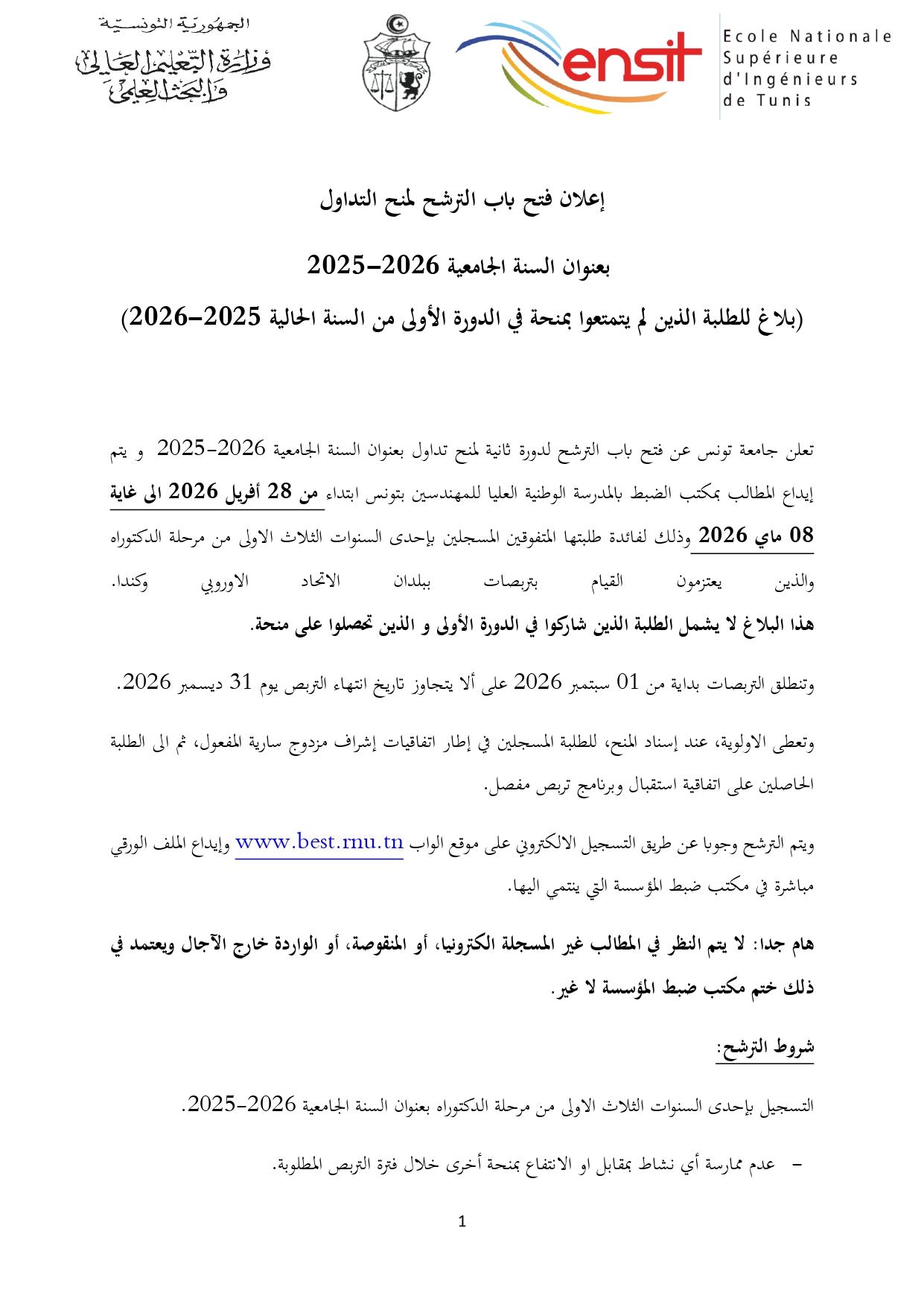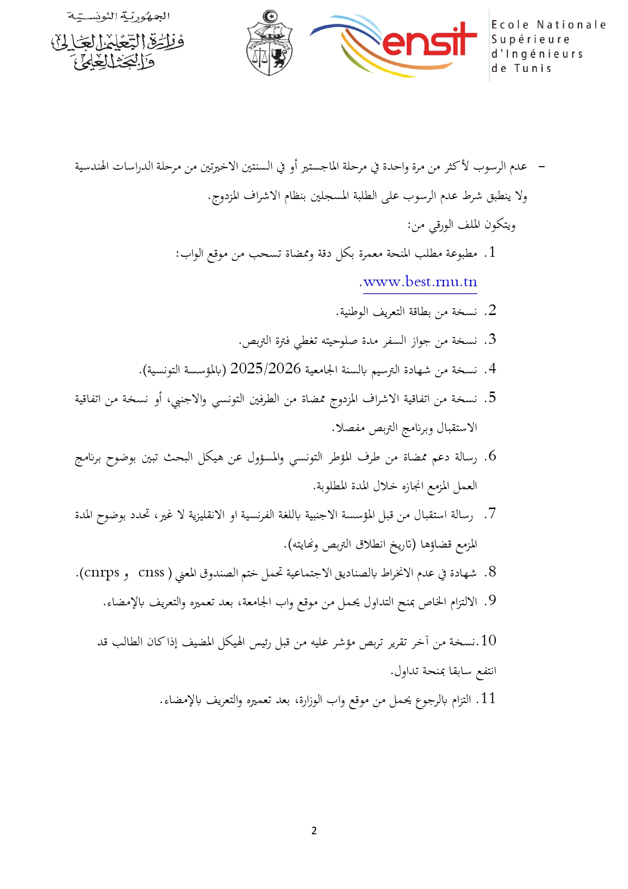 المدرسة الوطنية العليا للمهندسين بتونس : الترشح لمنح التداول (الدورة الثانية) 2025-2026