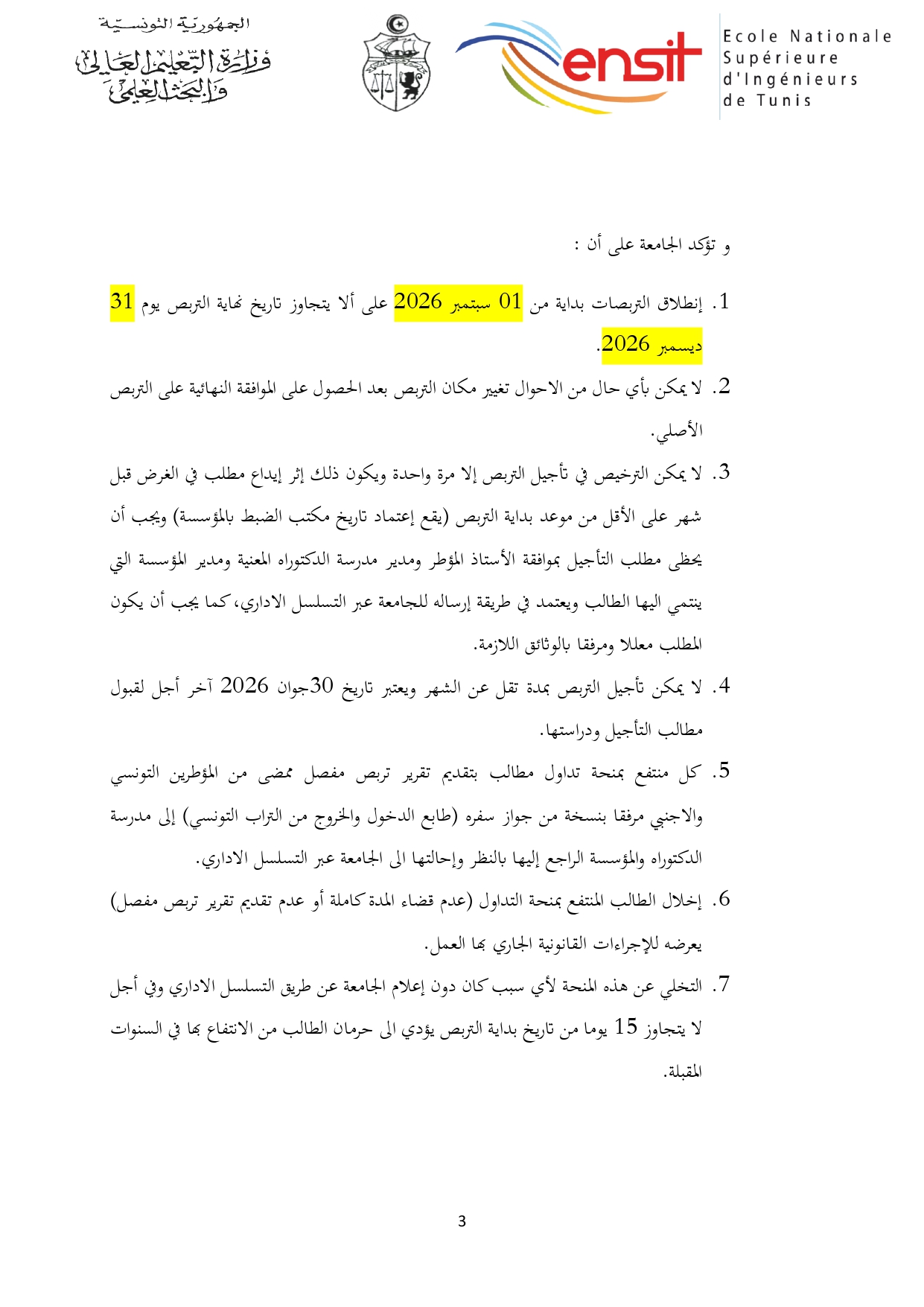 تنطلق التربصات من 01 سبتمبر 2026 على أن لا يتجاوز تاريخ إنتهاء التربص يوم 31 ديسمبر 2026.